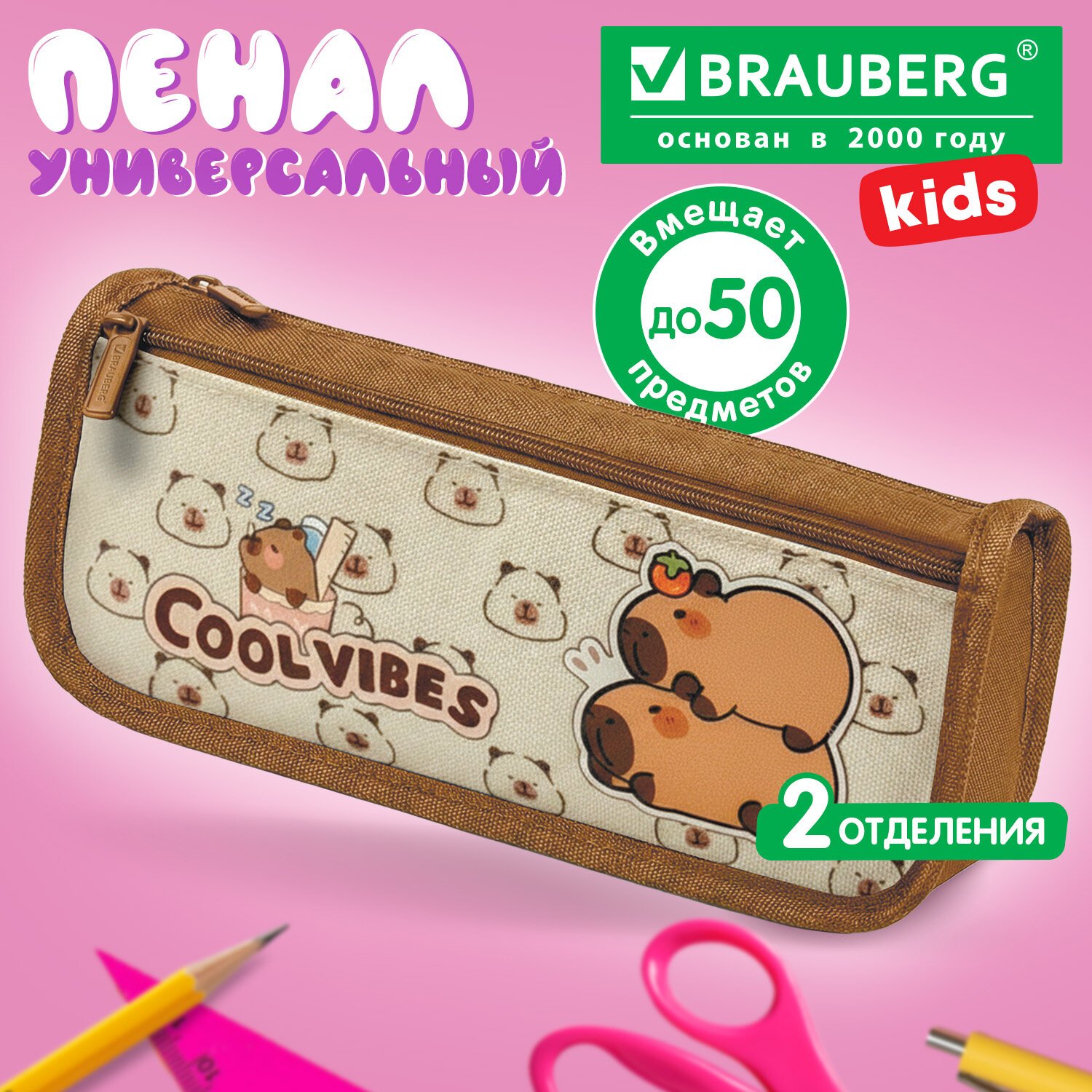 Пенал мягкий BRAUBERG KIDS, 2 отделения, полиэстер, "Capybaras", 22x10x6 см, 274582
