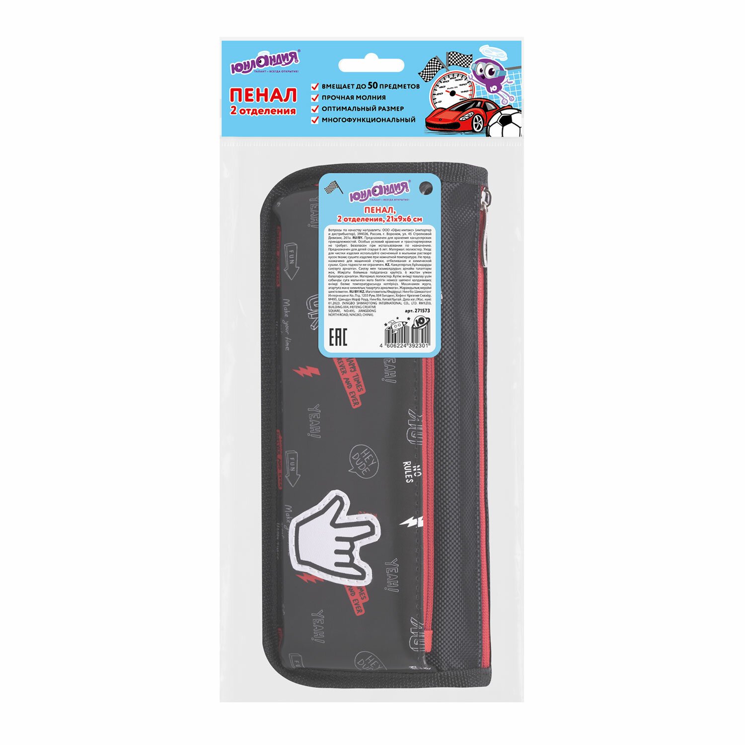 Пенал мягкий ЮНЛАНДИЯ, 2 отделения, полиэстер, "Speed car", черный, 21х6х9 см, 270273