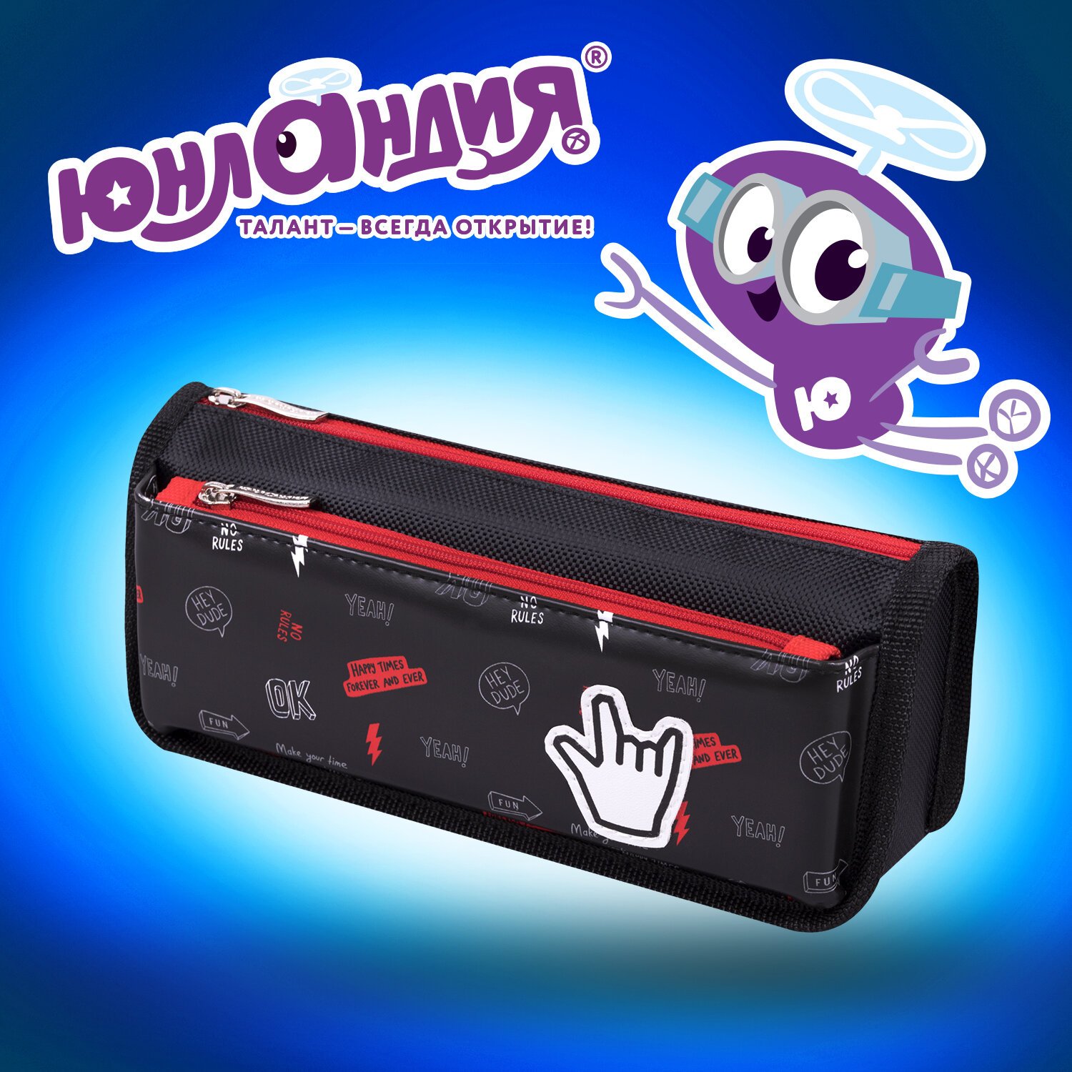 Пенал ЮНЛАНДИЯ предназначен для хранения школьных канцелярских принадлежностей. Застегивается на