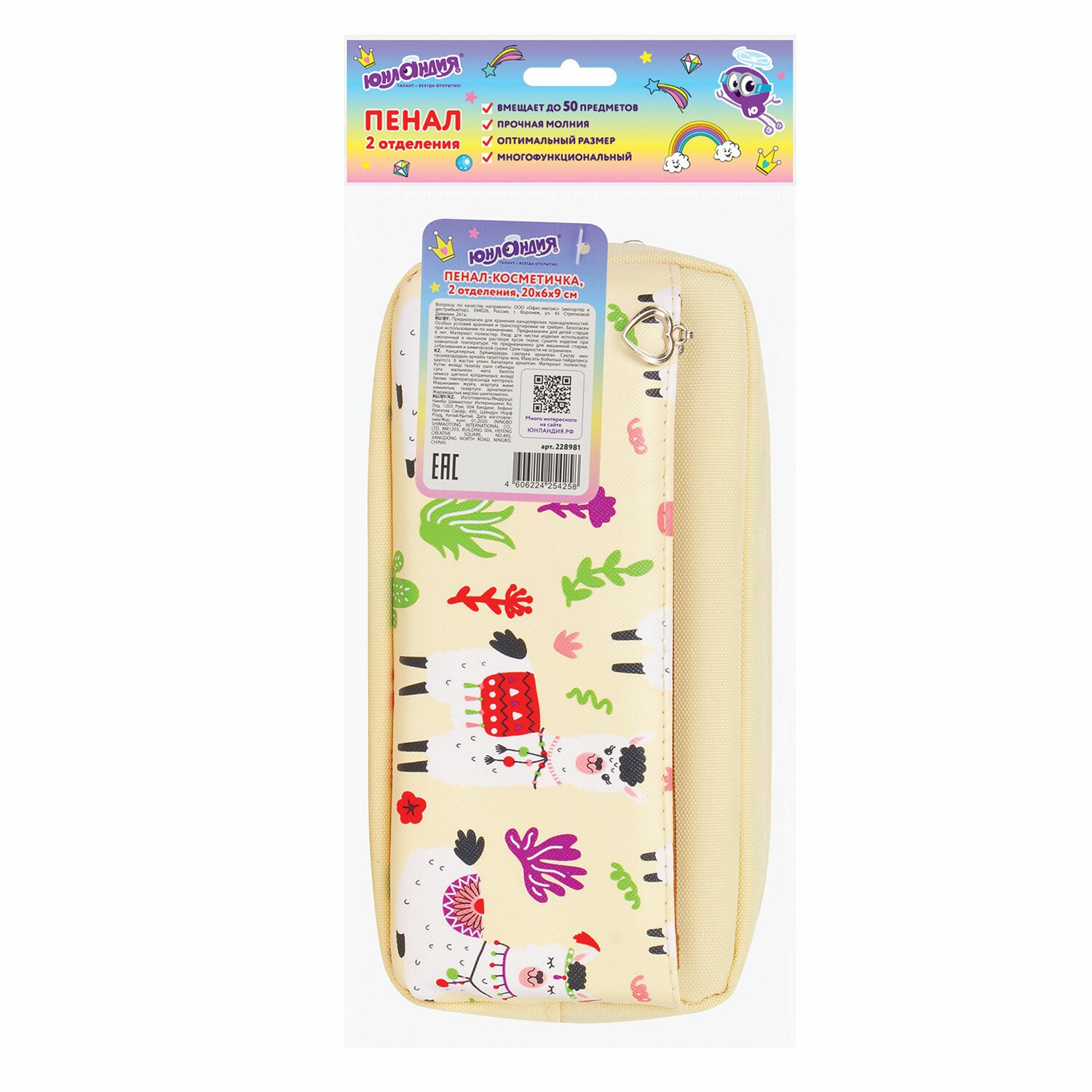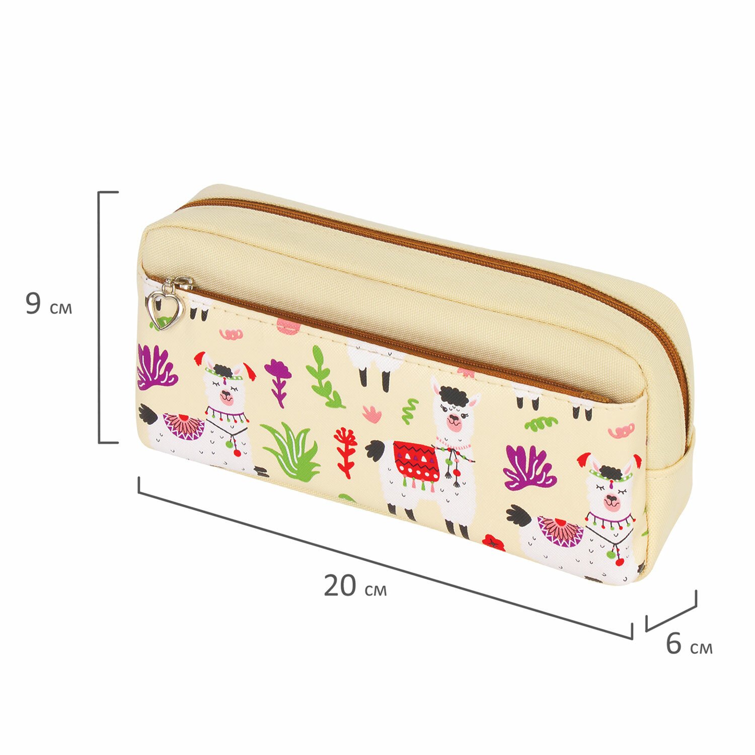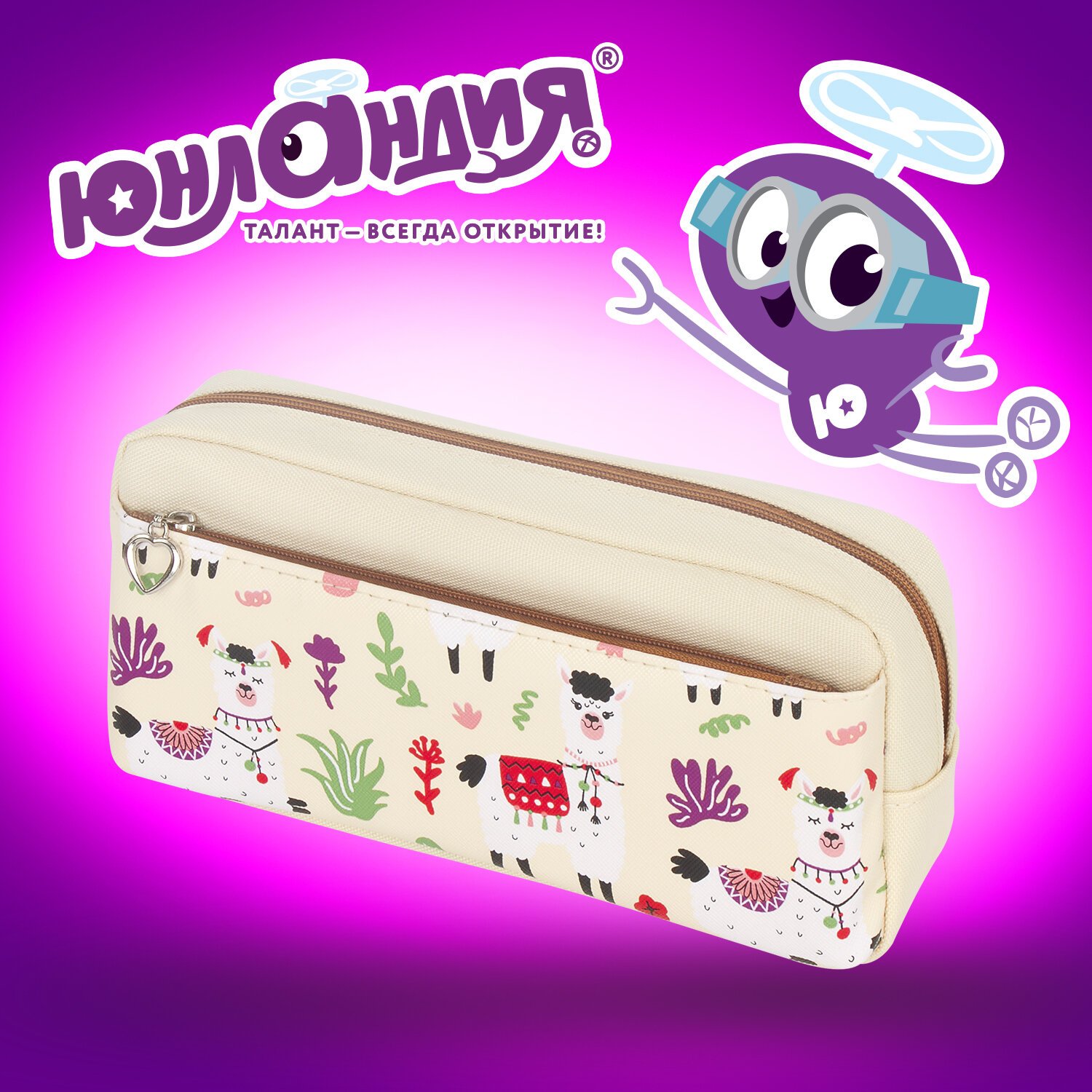 Пенал мягкий ЮНЛАНДИЯ, 2 отделения, полиэстер, "Llama", бежевый, 20х6х9 см, 228981
