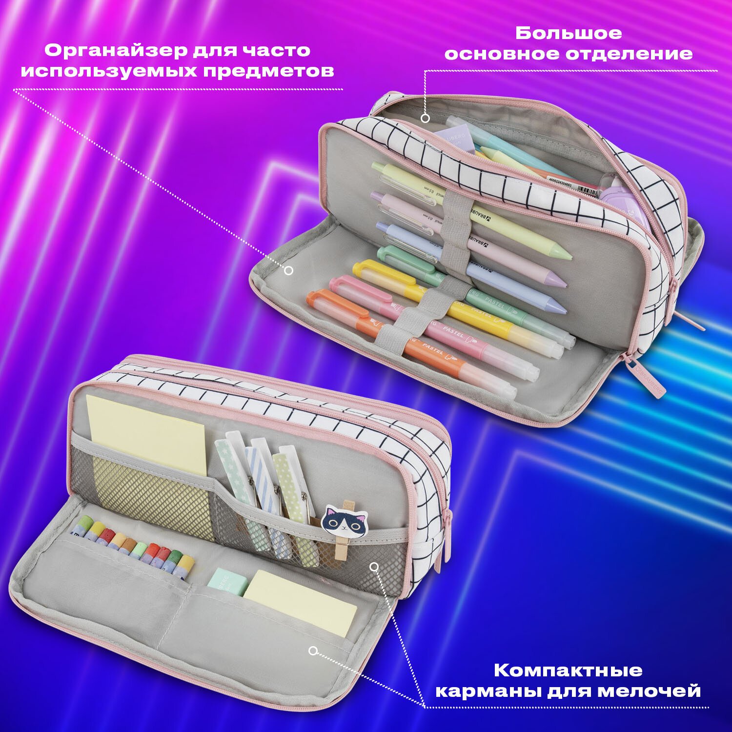 Мягкий пенал BRAUBERG MOMENTS с 2 откидными планками выполнен из прочного полиэстера. Вмещает до 70 предметов.