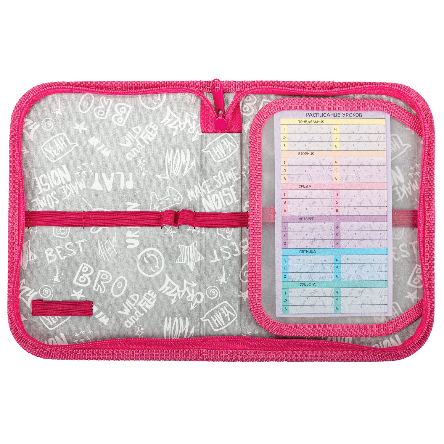 Материал пенала – полиэстер с цветной печатью и ярким дизайном. Основа пенала – плотный картон, обшитый тканью по краям. Такая конструкция отличается износостойкостью и прочностью, поможет защитить канцелярские принадлежности от повреждений. Внутри пенала на каждой створке прочные резинки для канцелярских принадлежностей, также пенал оснащен откидной планкой с органайзером и прозрачным кармашком для расписания уроков. Шаблон расписания уроков идет в подарок! Внутренняя часть выполнена из картона с глянцевой ламинацией.