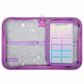 Внутри пенала на каждой створке - прочные резинки для канцелярских принадлежностей, также пенал оснащен откидной планкой с органайзером и прозрачным кармашком для расписания уроков. Шаблон расписания уроков идет в подарок! Внутренняя часть выполнена из картона с глянцевой ламинацией с узором.