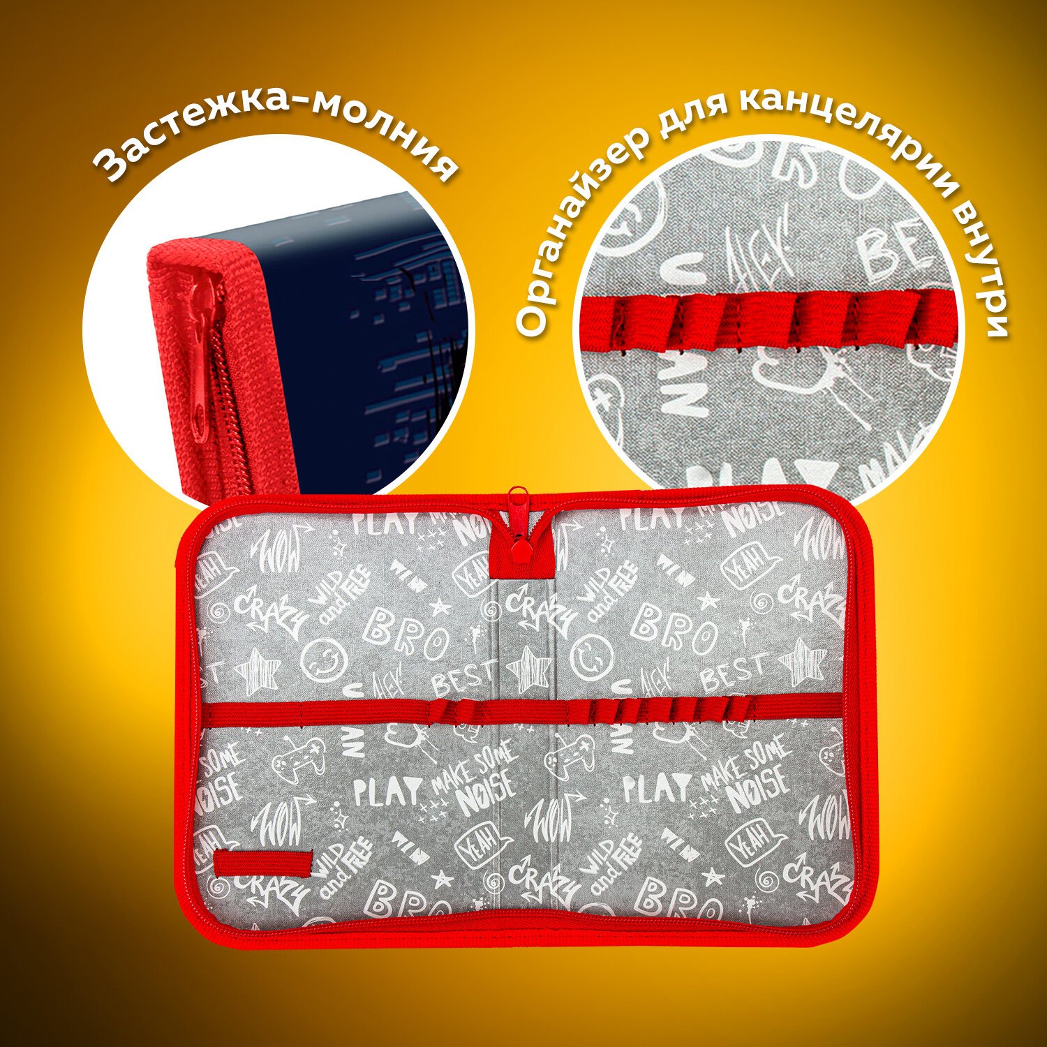 Материал пенала – полиэстер с цветной печатью и ярким дизайном. Основа пенала – плотный картон, обшитый тканью по краям. Такая конструкция отличается износостойкостью и прочностью, поможет защитить канцелярские принадлежности от повреждений. Внутри пенала на каждой створке прочные резинки для канцелярских принадлежностей, внутренняя часть выполнена из картона с глянцевой ламинацией.