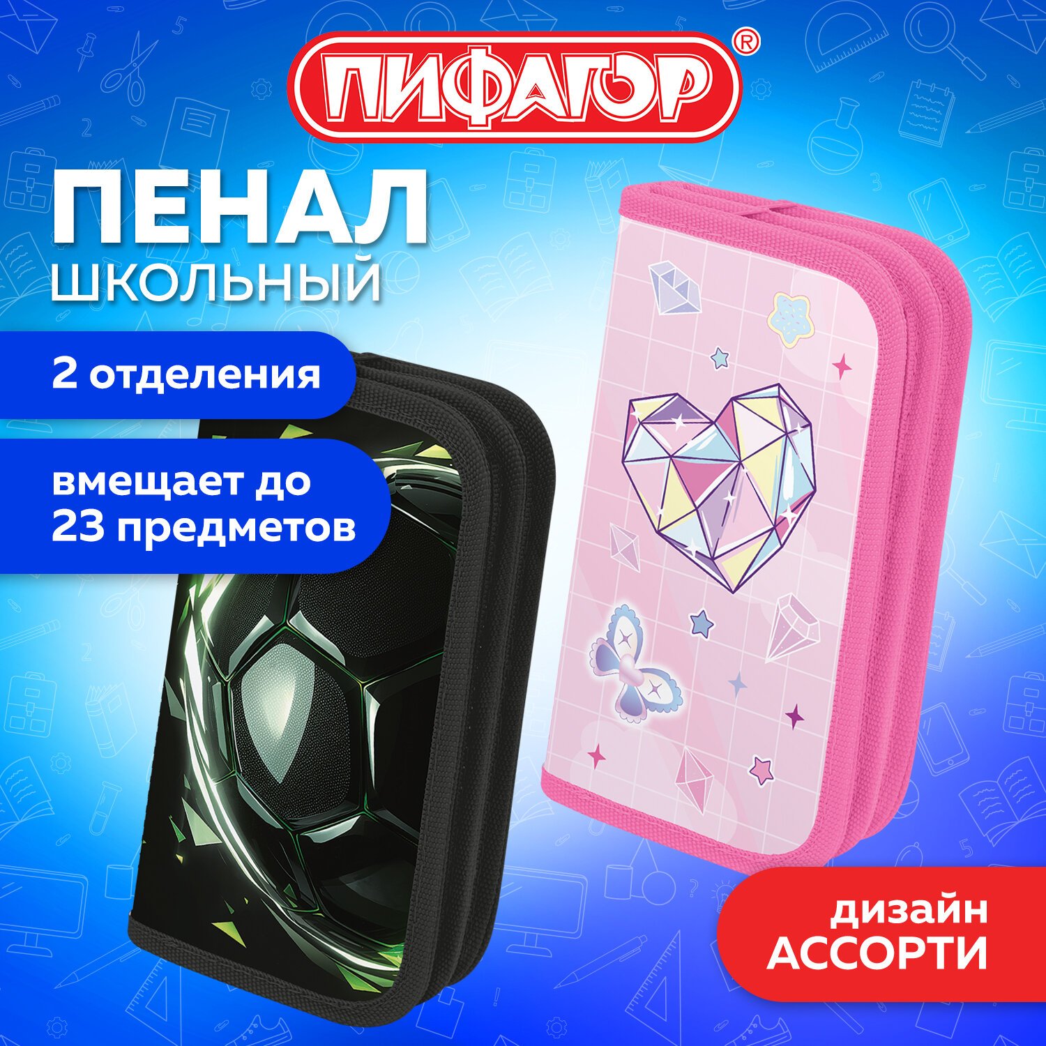 Пенал ПИФАГОР, 2 отделения, ламинированный картон, 19х11 см, АССОРТИ, 274560
