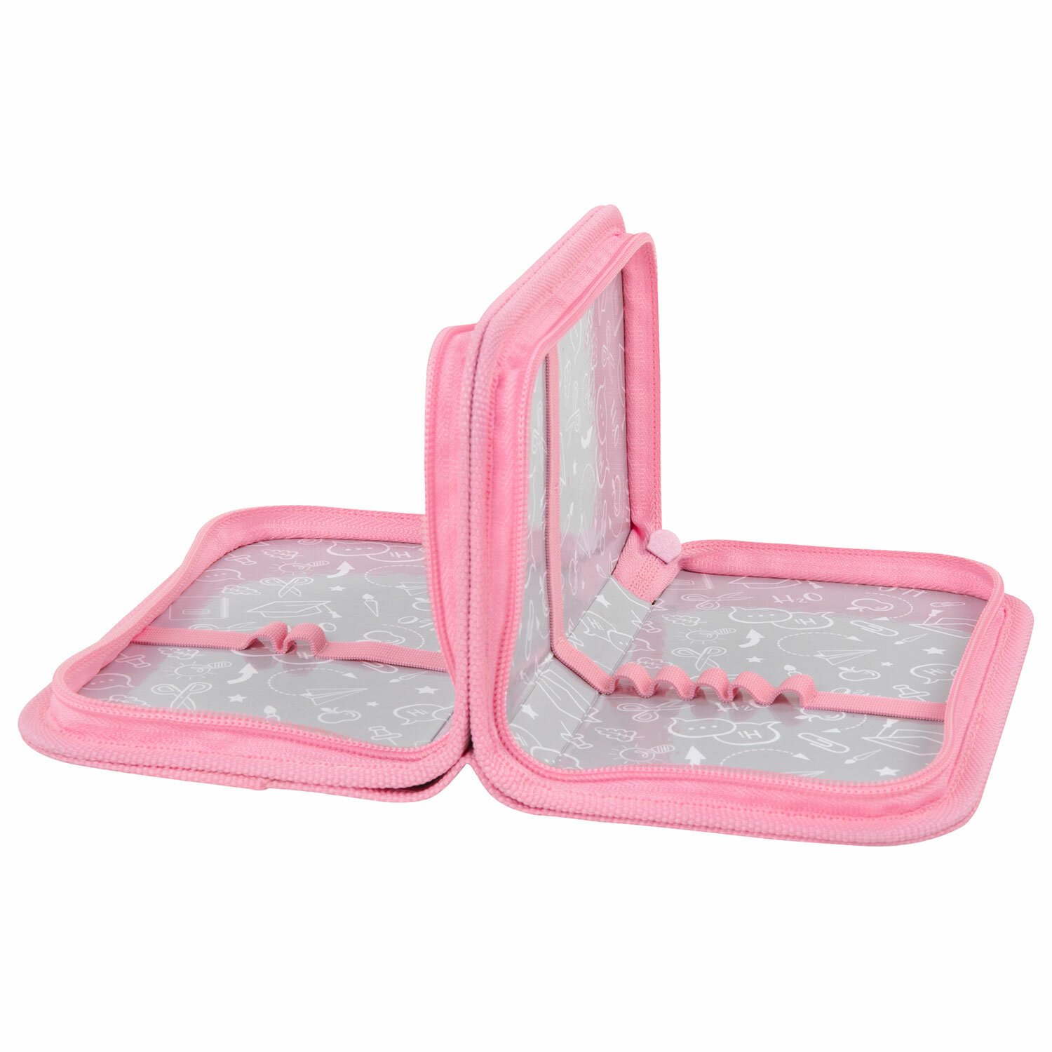 Пенал имеет 2 отделения, внутри на каждой створке имеются прочные резинки для канцелярских принадлежностей. Внутренняя часть выполнена из картона с глянцевой ламинацией с узором.