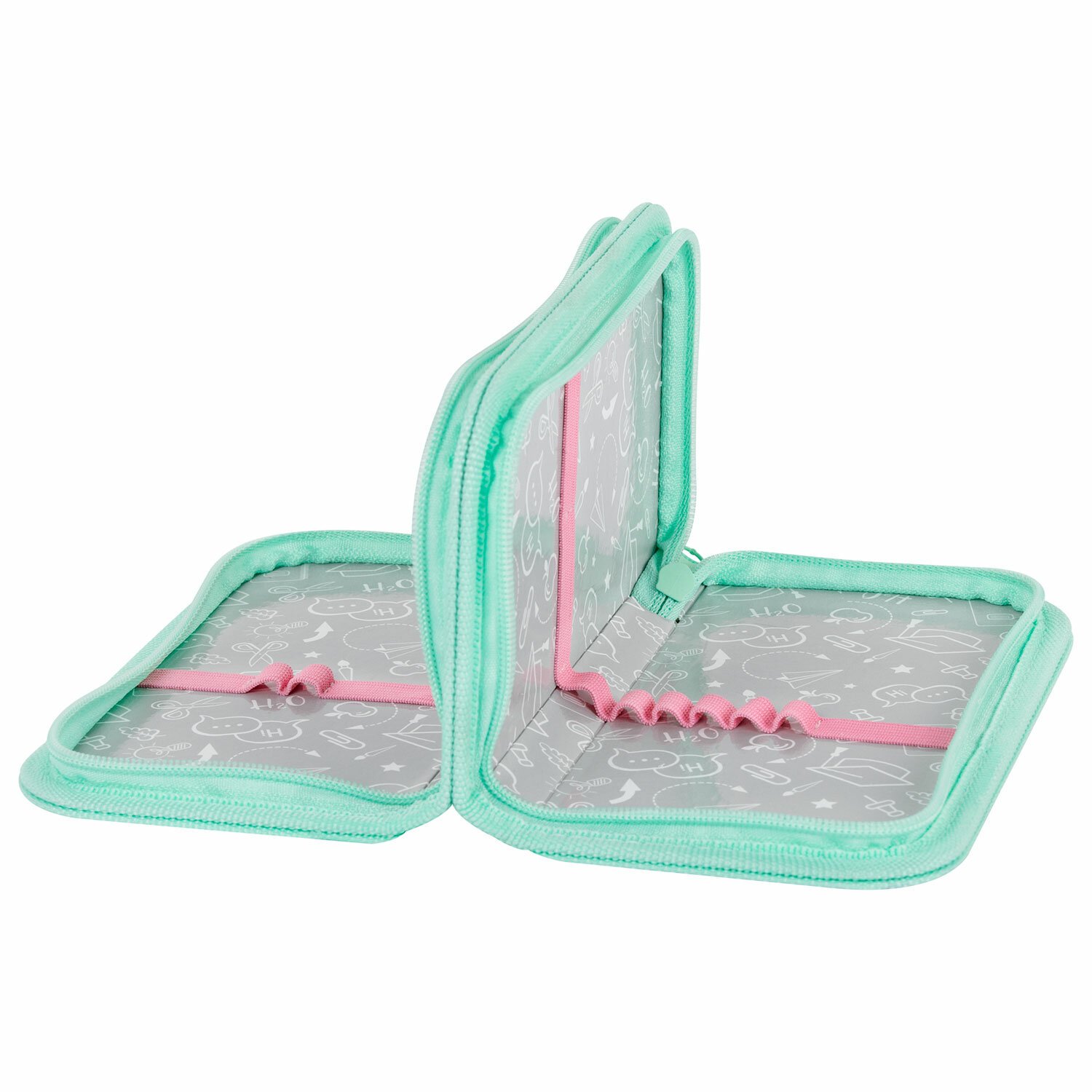 Пенал имеет 2 отделения, внутри на каждой створке имеются прочные резинки для канцелярских принадлежностей. Внутренняя часть выполнена из картона с глянцевой ламинацией с узором.