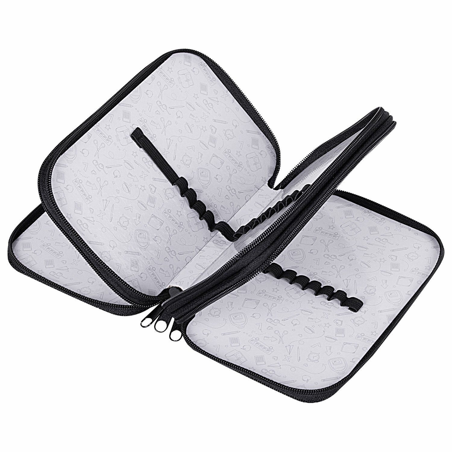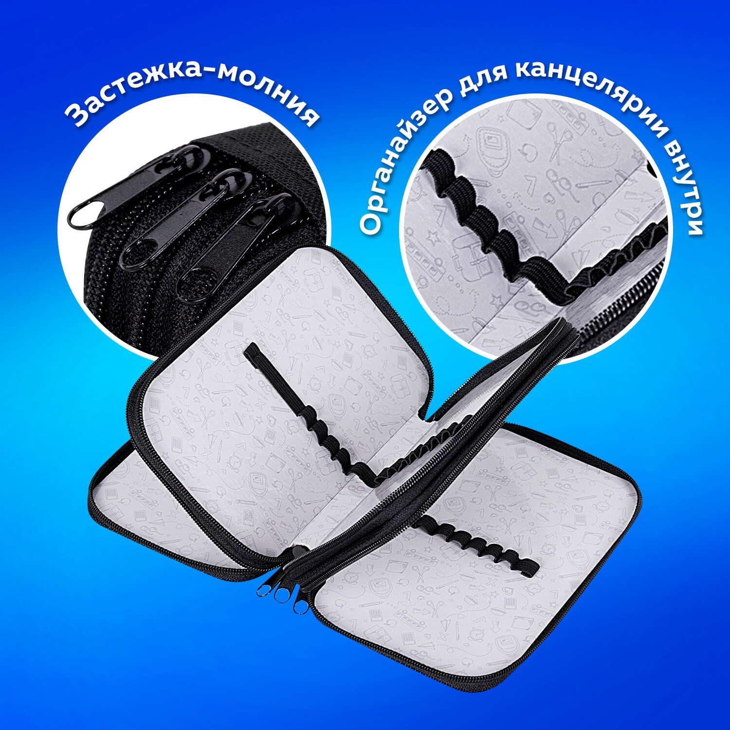 Пенал имеет 3 отделения, внутри на каждой створке имеются прочные резинки для канцелярских принадлежностей, внутренняя часть выполнена из картона с глянцевой ламинацией с узором.