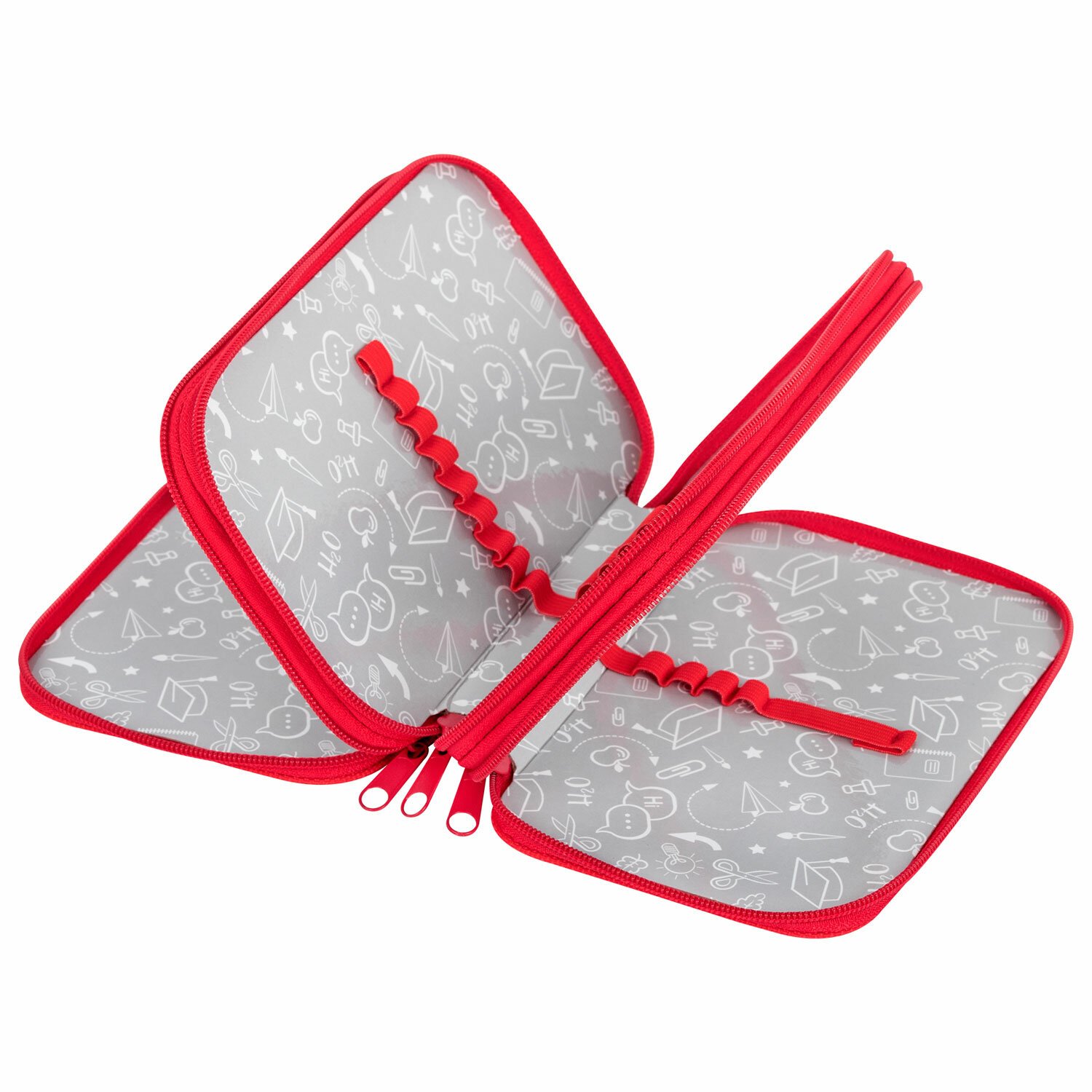 Пенал ПИФАГОР яркого дизайна с тремя отделениями выполнен из ламинированного картона, имеет тканевый торец. Удобные молнии с металлическим бегунком с трех сторон, прочные резинки для предметов. Вмещает до 42 предметов.