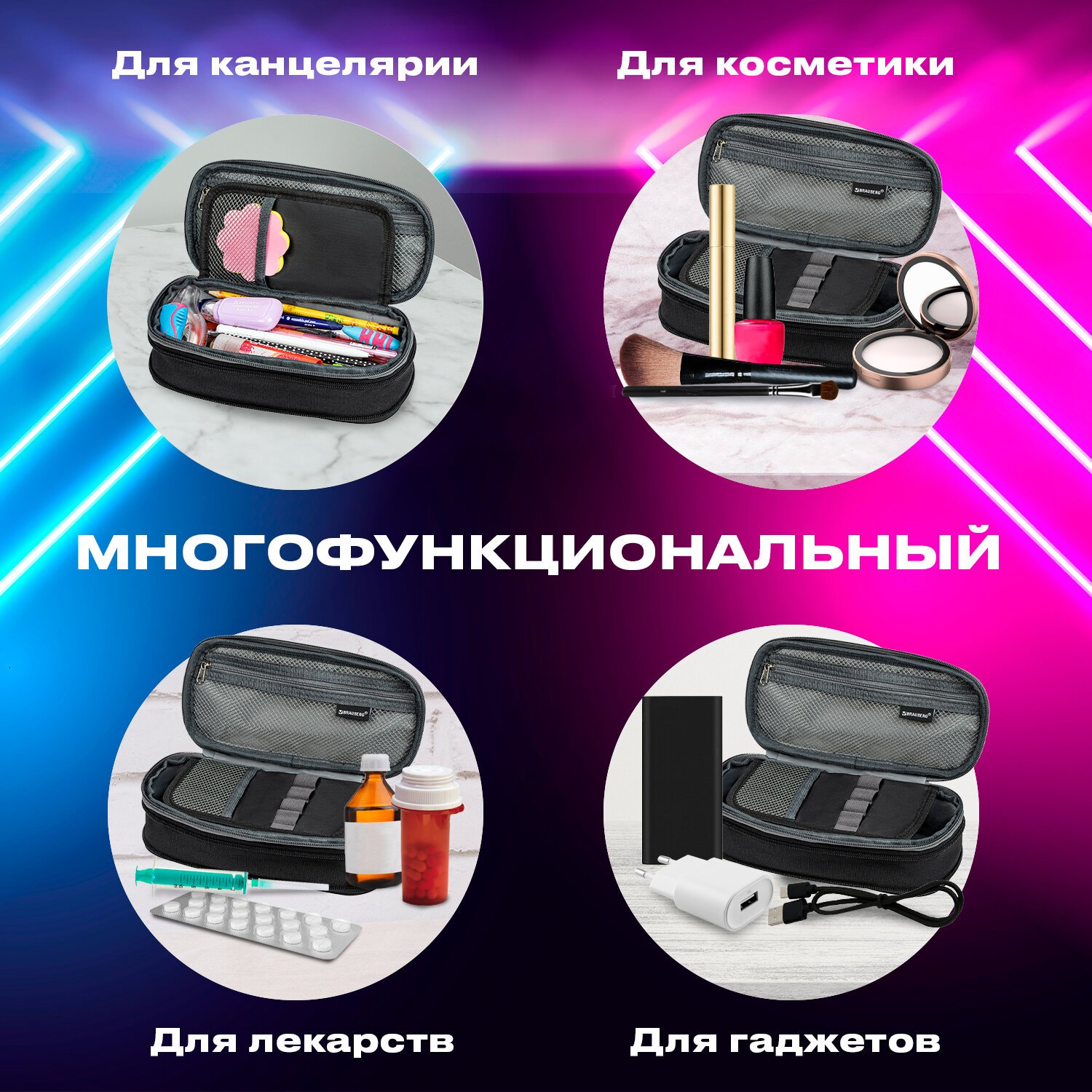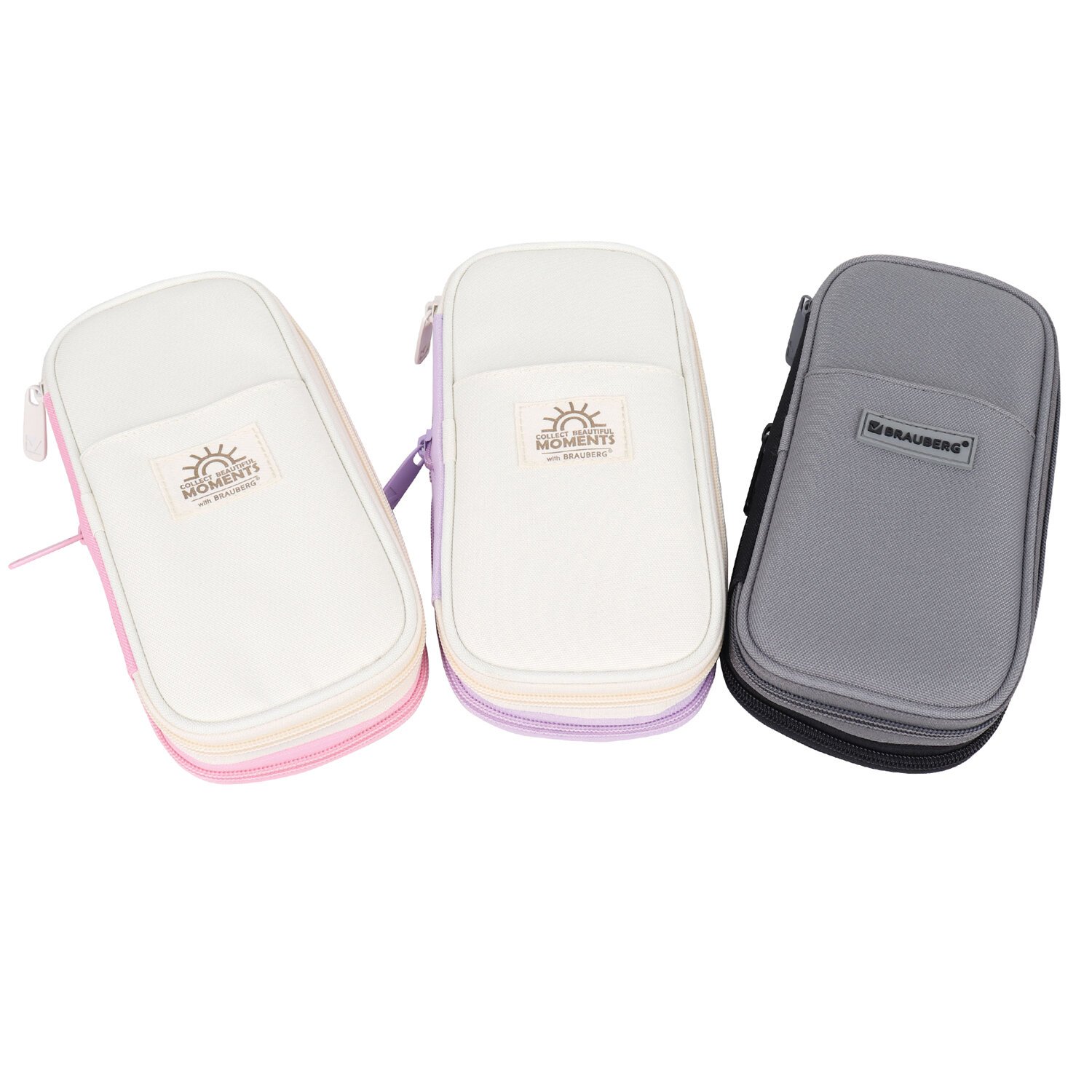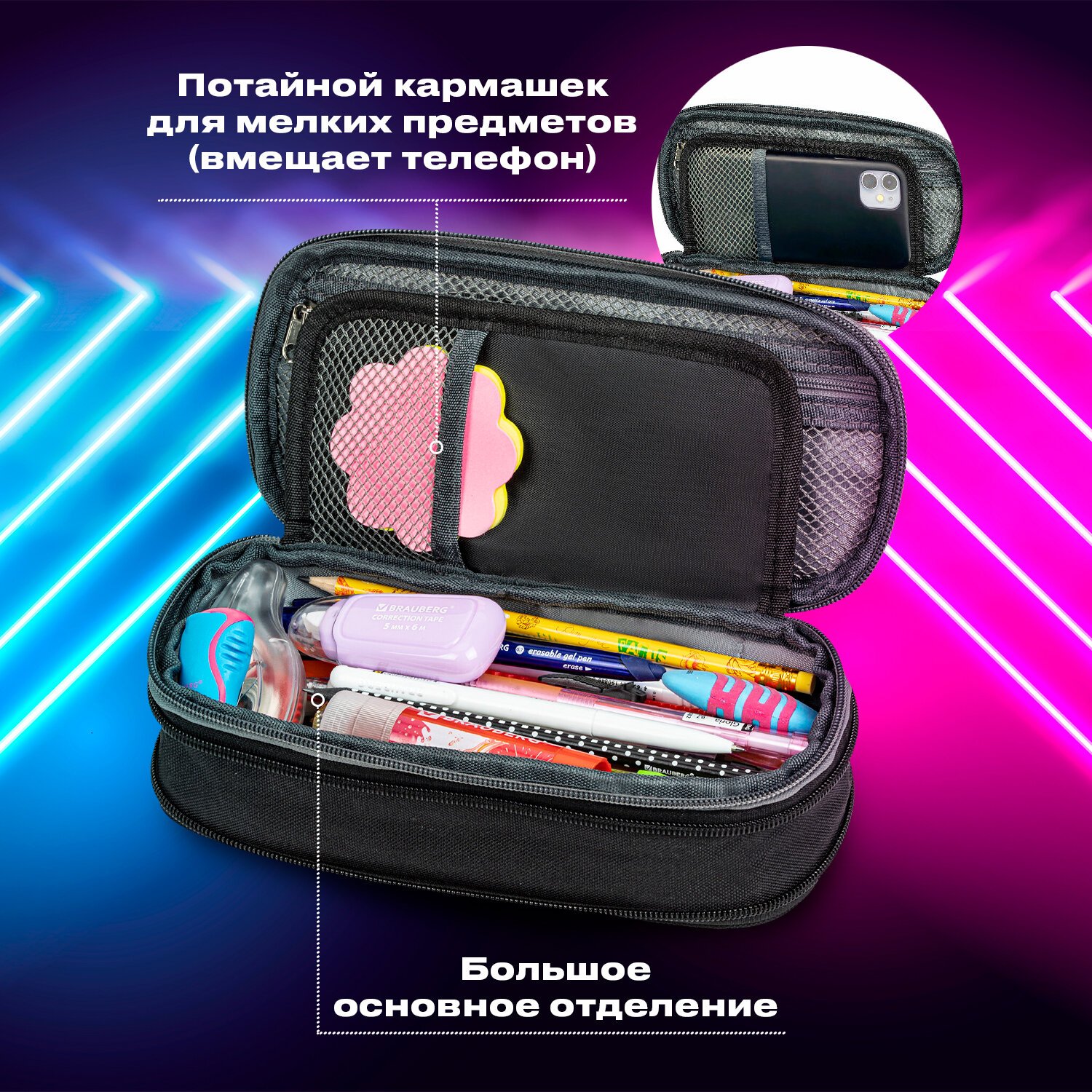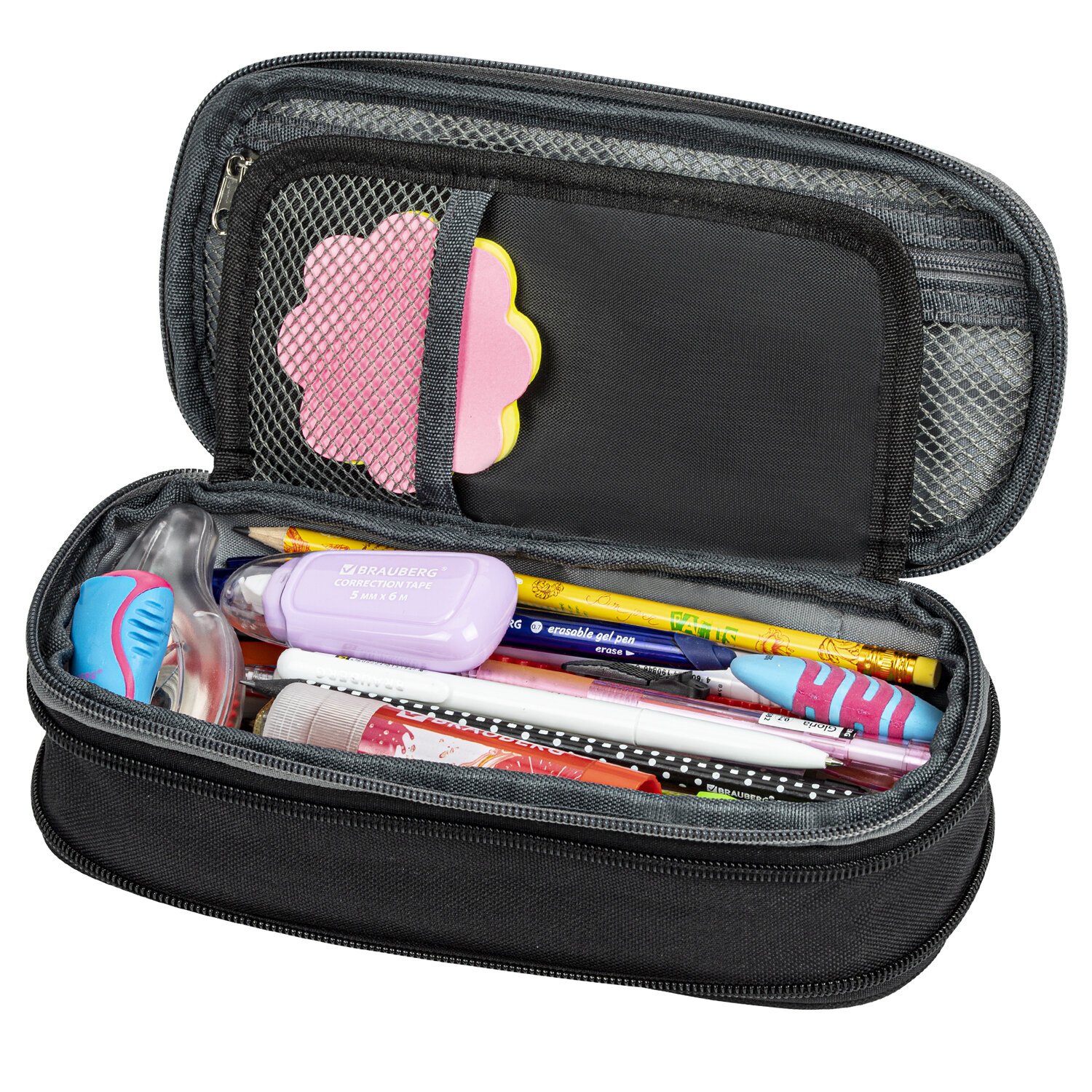 Пенал-трансформер BRAUBERG "Charcoal gray" вместительного размера 22х10 см, с возможностью трансформировать объем с 3 см до 6,5 см при помощи двойной застежки-молнии снаружи.