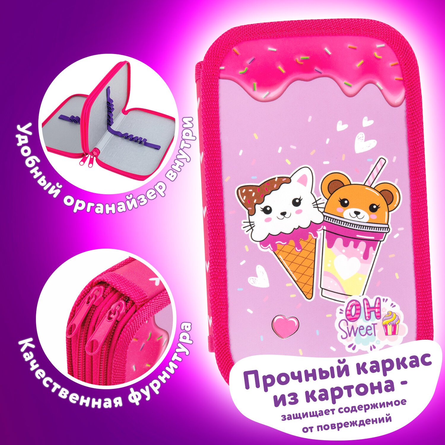 Материал пенала – картон с покрытием soft-touch и ярким дизайном. Основа пенала – плотный картон, обшитый тканью по краям. Такая конструкция отличается износостойкостью и прочностью, поможет защитить канцелярские принадлежности от повреждений.