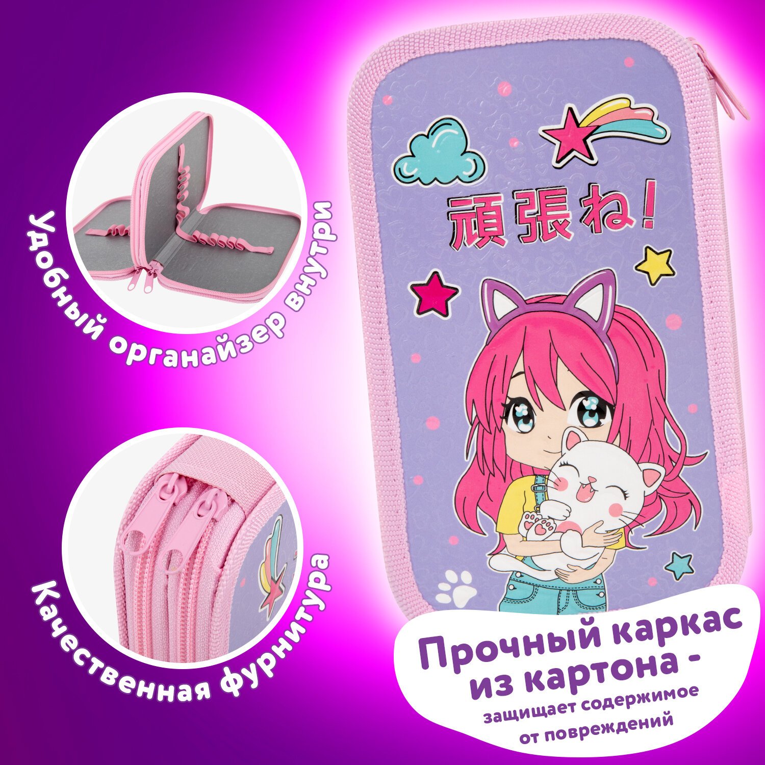 Материал пенала – ламинированный картон с цветной печатью, ярким дизайном и объемным рисунком – конгревом. Основа пенала – плотный картон, обшитый тканью по краям, с тканевым торцом. Такая конструкция отличается износостойкостью и прочностью, поможет защитить канцелярские принадлежности от повреждений.