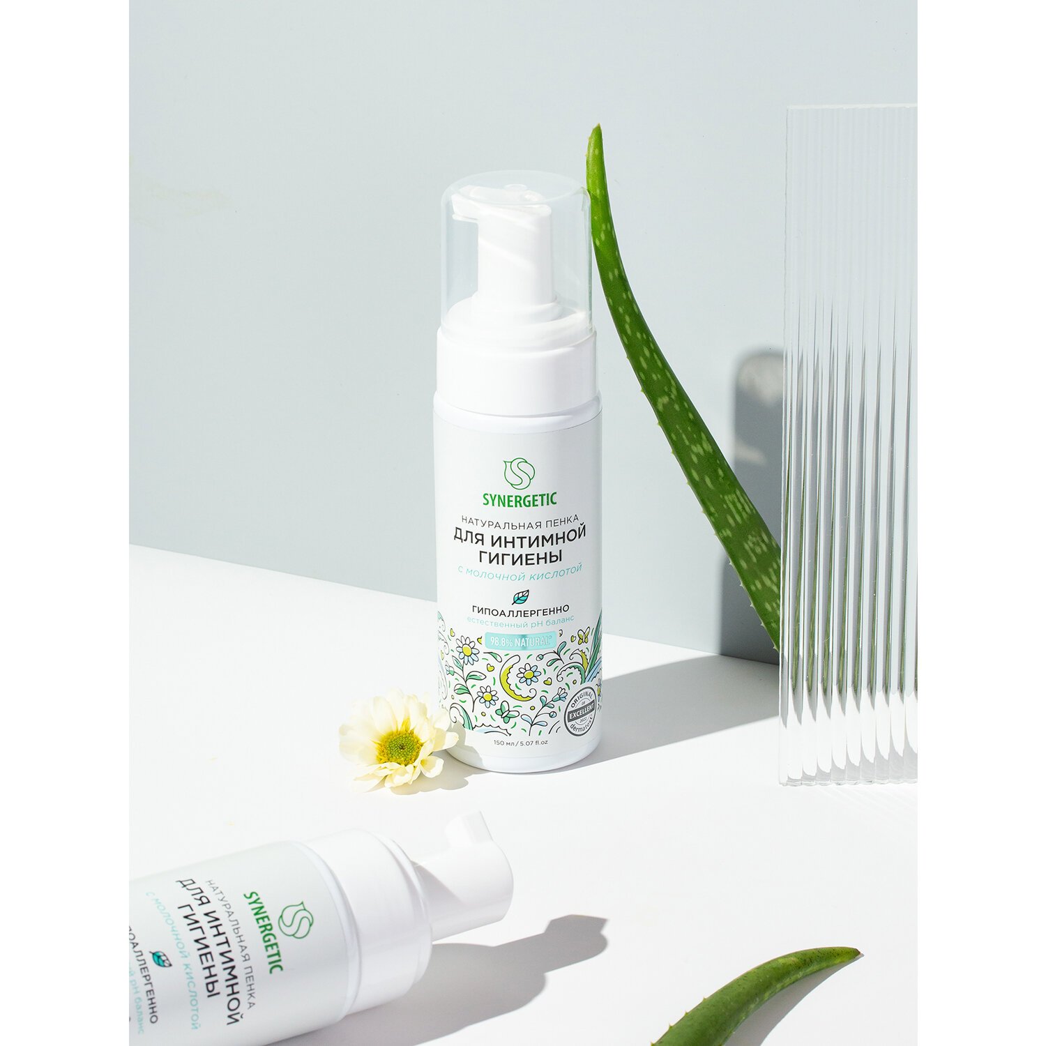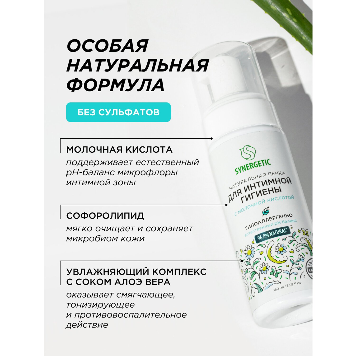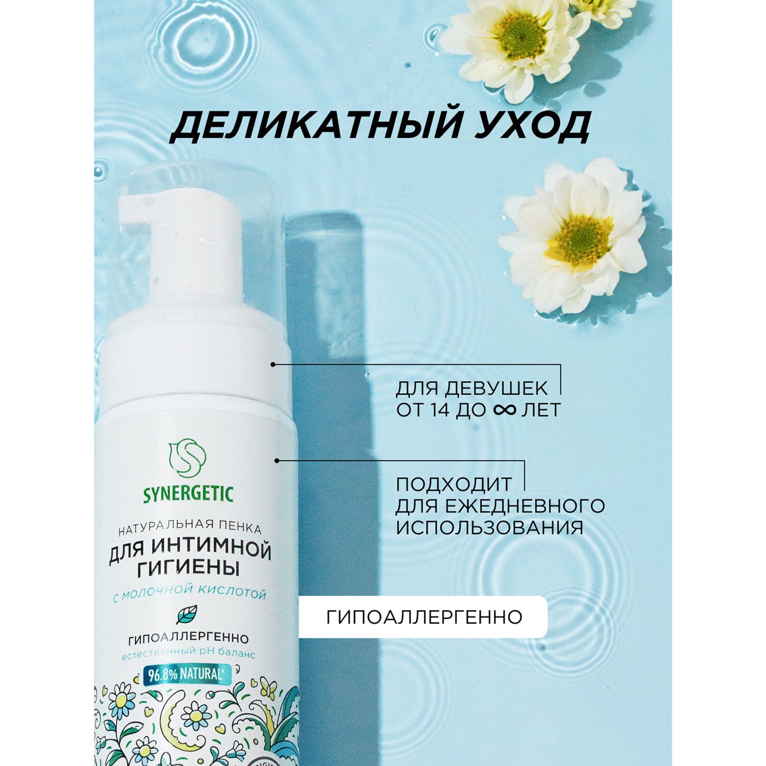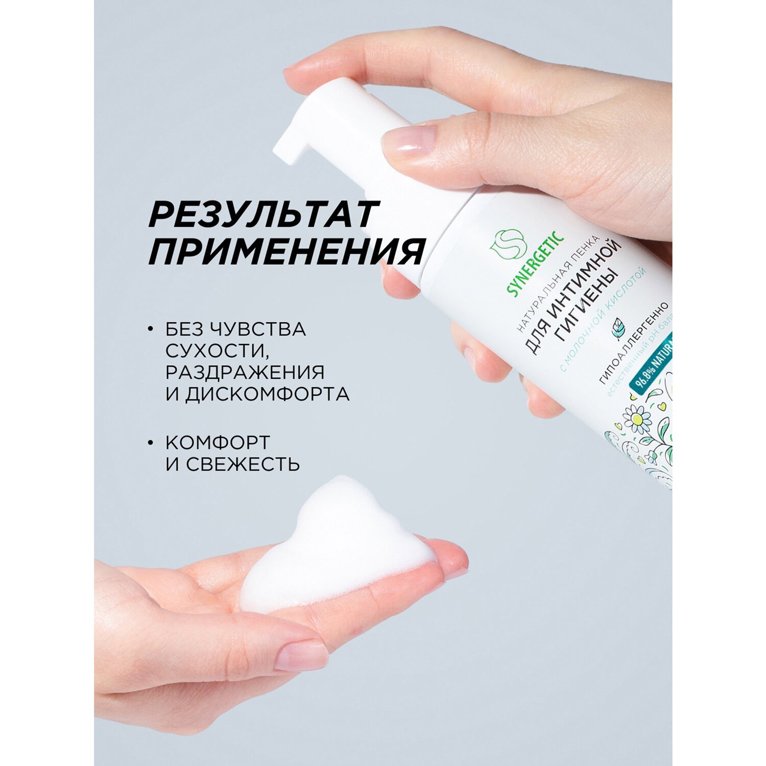 Натуральная пенка SYNERGETIC для интимной гигиены имеет легкую невесомую текстуру и обеспечивает деликатный ежедневный уход за самыми нежными местами.