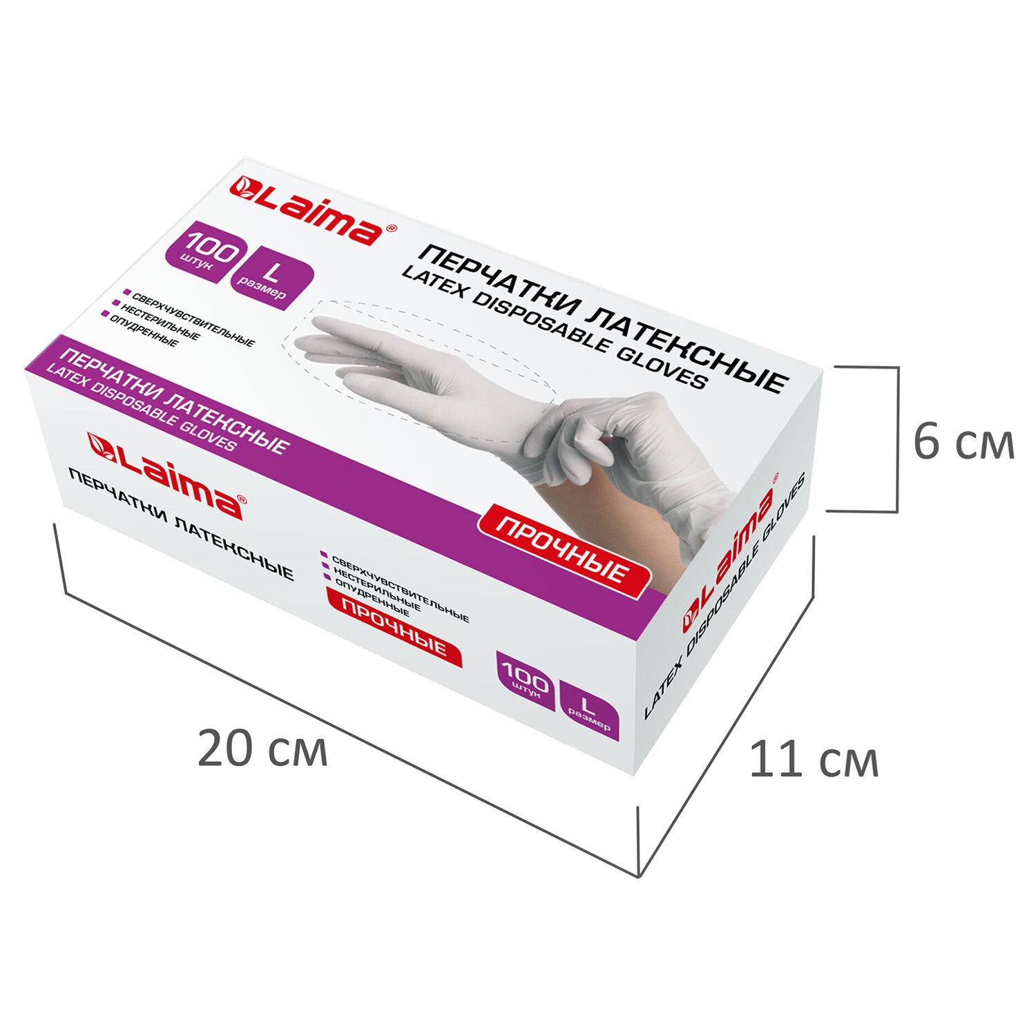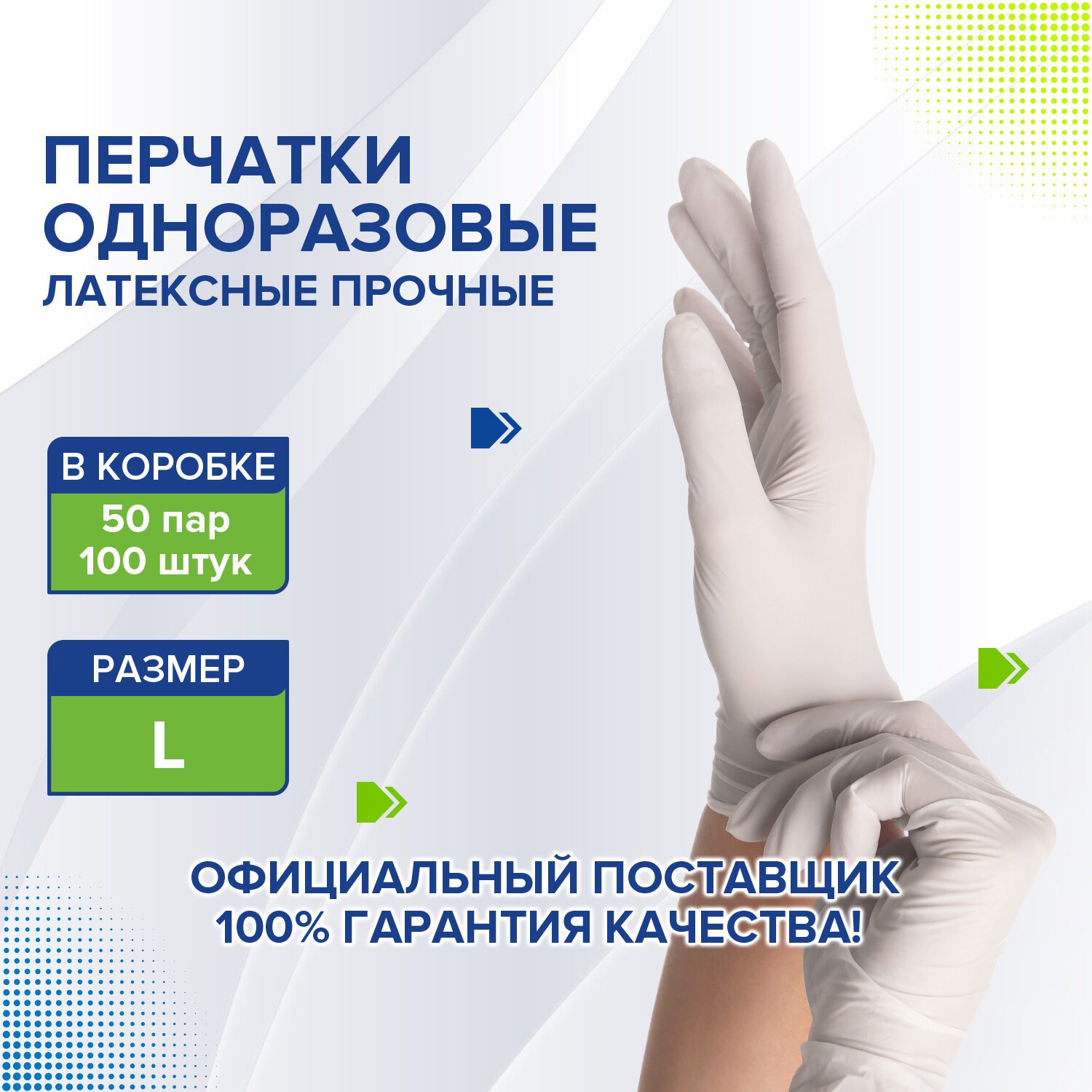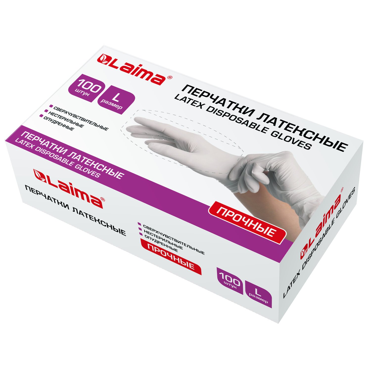 Перчатки латексные белые, 50 пар (100 шт.), опудренные, прочные, размер L (большой), LAIMA, 605022