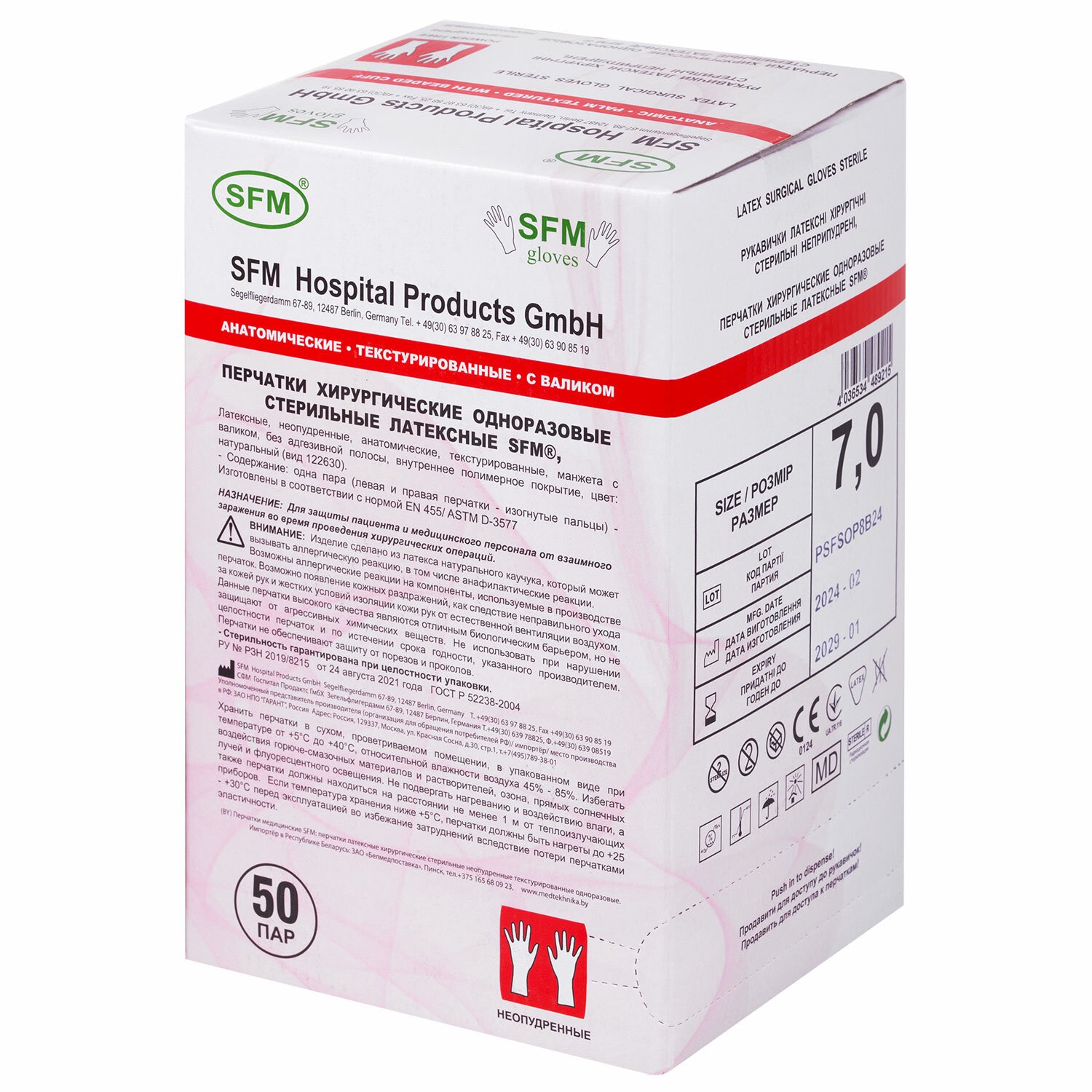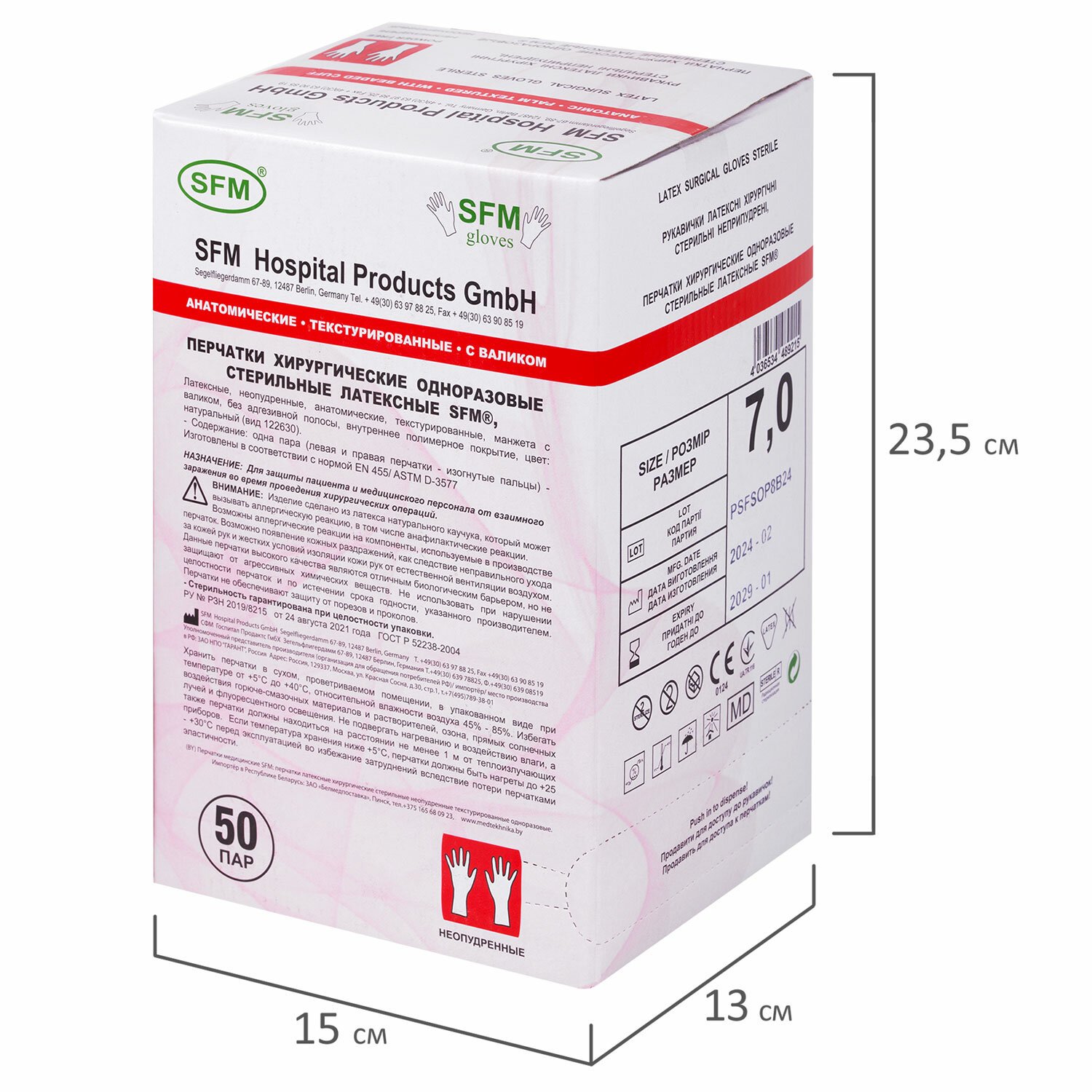Перчатки латексные стерильные хирургические, КОМПЛЕКТ 50 пар (100 штук), неопудренные, размер М (7), SFM