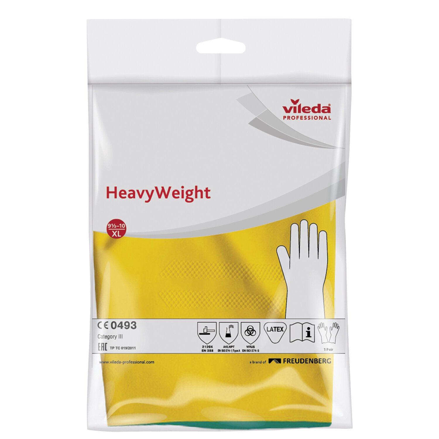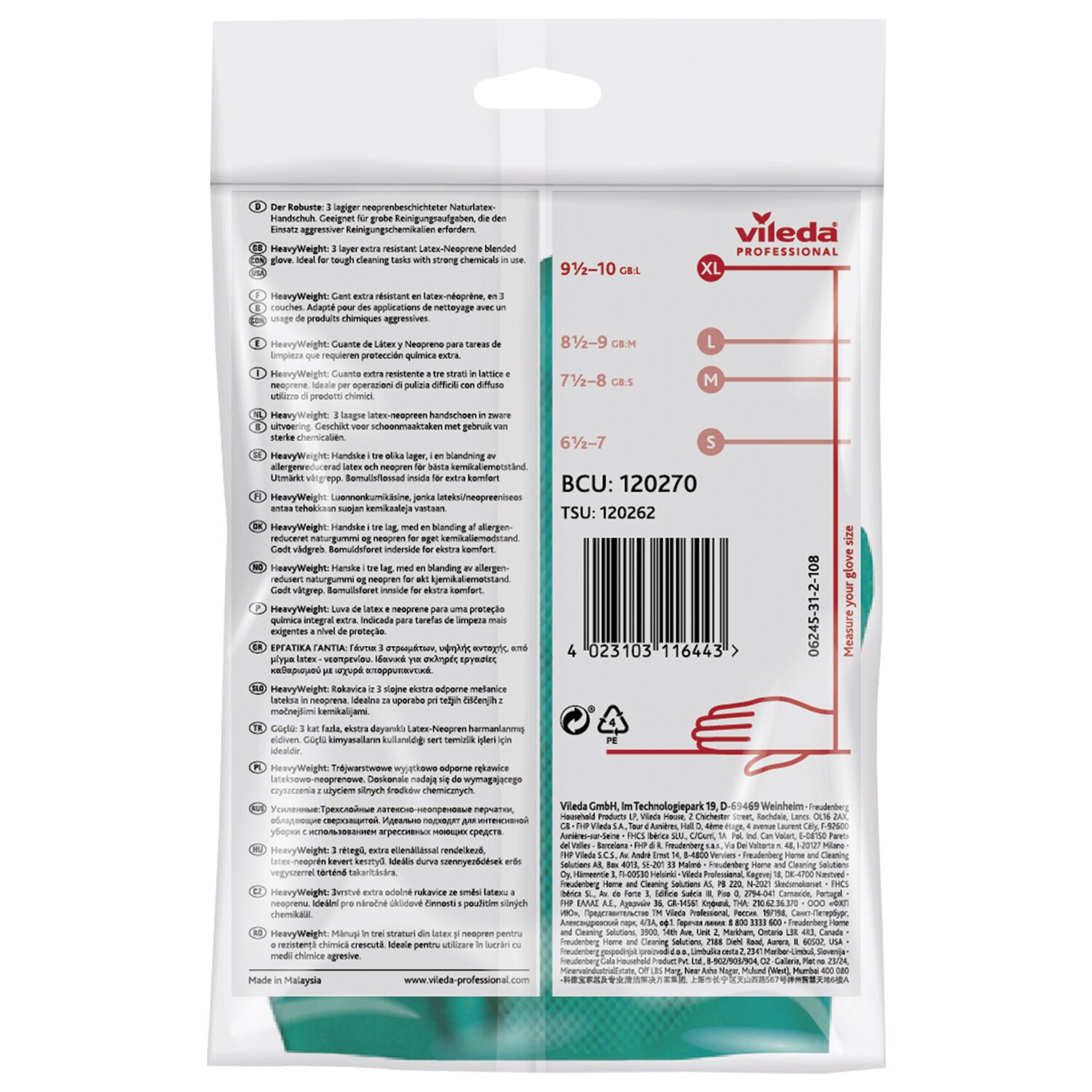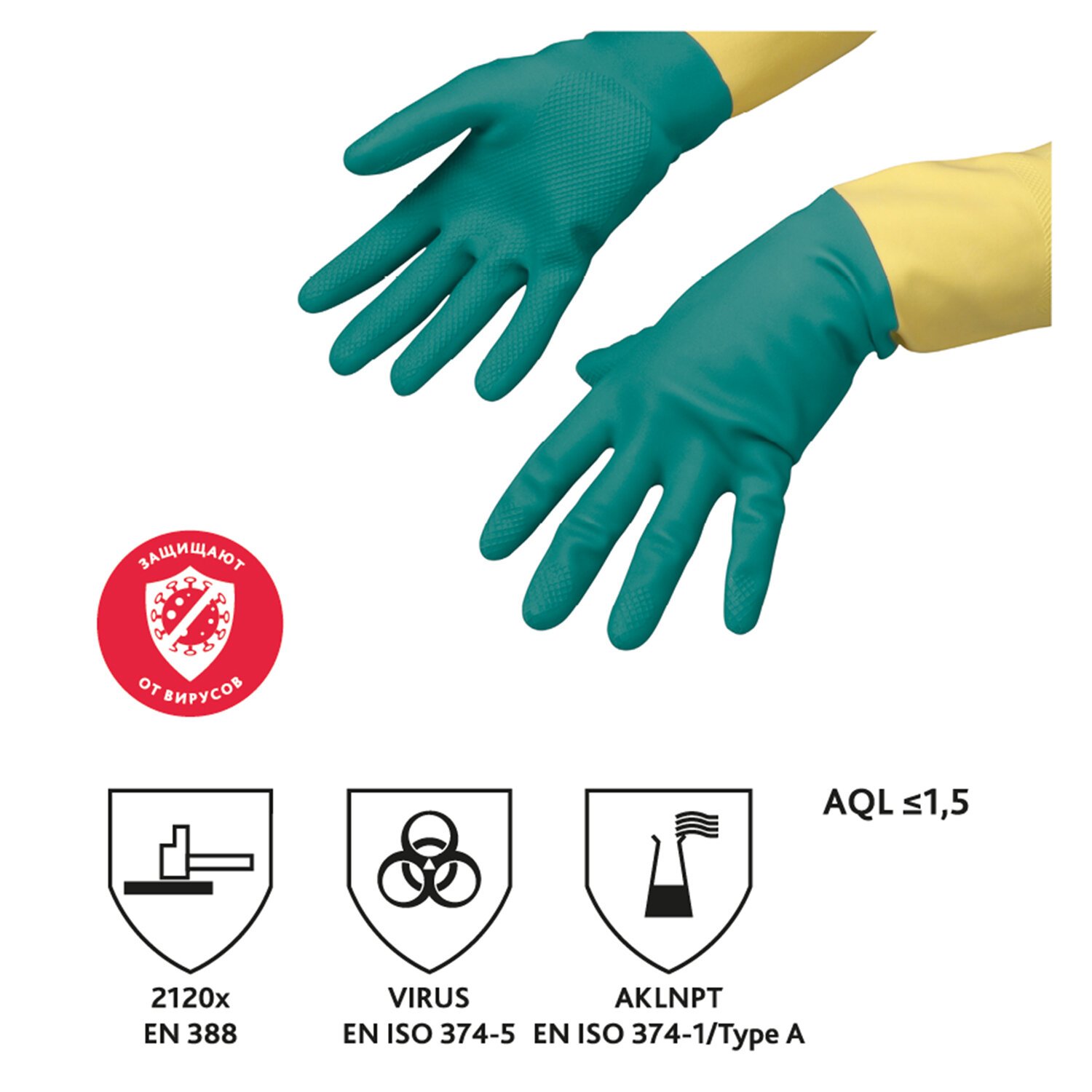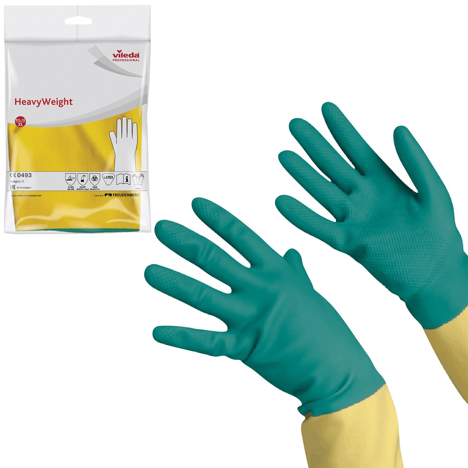 Перчатки МНОГОРАЗОВЫЕ латексные VILEDA, х/б напыление, СВЕРХПРОЧНЫЕ (неопрен), размер XL (очень большой), зелено-желтый, вес 130 г, 120270