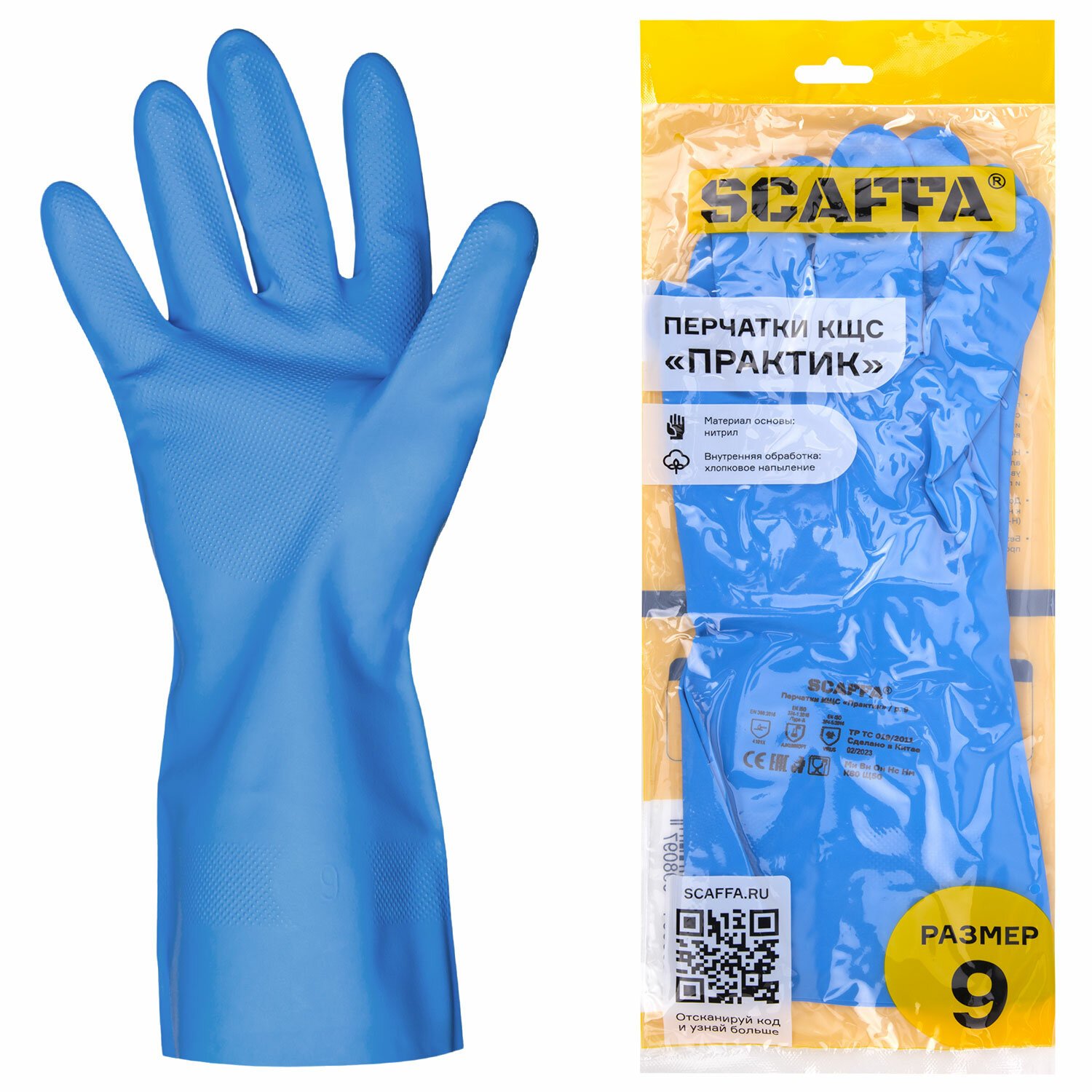 Перчатки нитриловые SCAFFA Практик, КЩС, хлопчатобумажное напыление, р. 9, L, синие,, 00-01017722