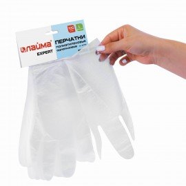 Одноразовые перчатки большого размера L выполнены из полиэтилена плотностью 6 микрон и имеют гладкий срез манжеты. Устойчивы к химическим средствам. Сохраняют тактильные ощущения. Отсутствие технической пудры на перчатках максимально уменьшает риск загрязнения как рук, так и продукции. 50 пар в упаковке. Поставляются в пакете с европодвесом.