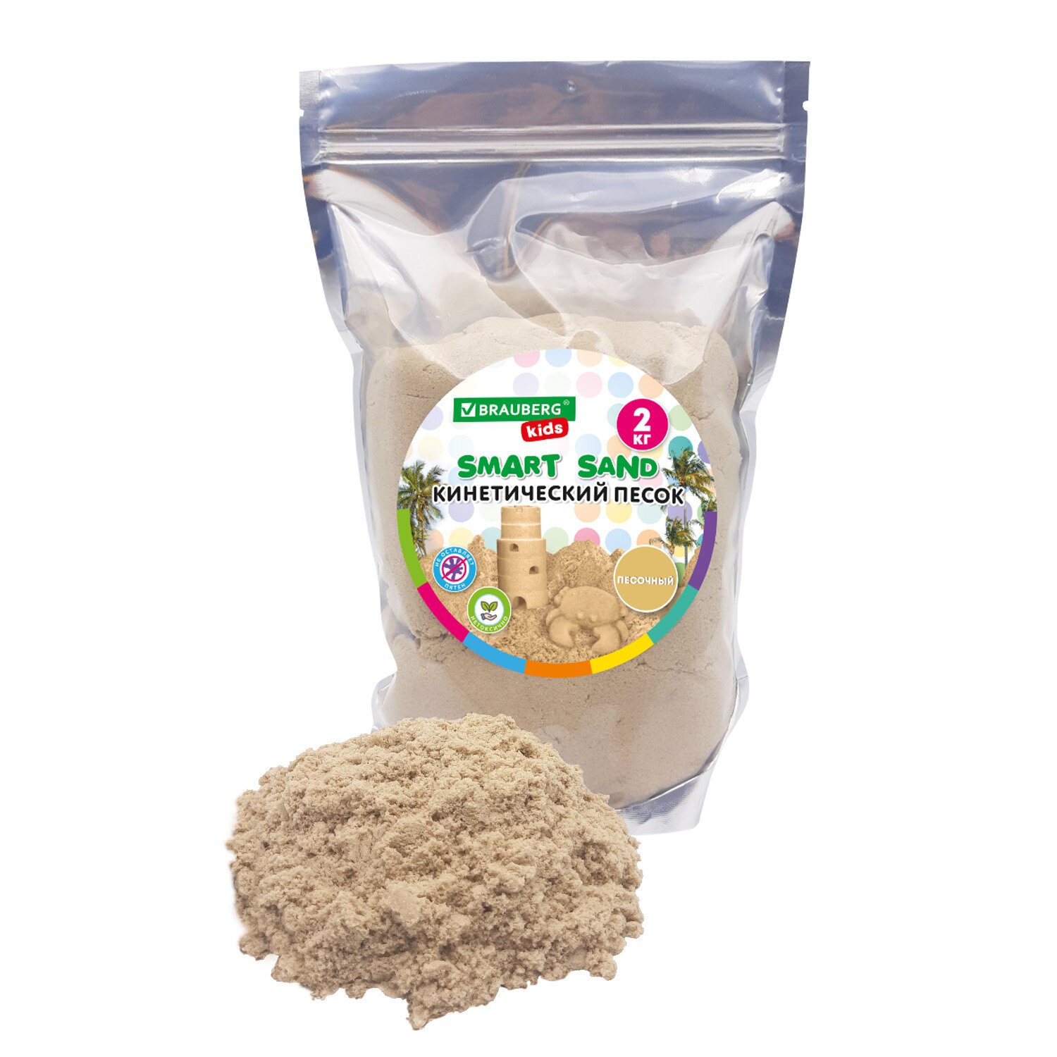 Безопасный кинетический песок BRAUBERG KIDS по текстуре похож на влажный морской песок, но вместе с этим он абсолютно сухой, приятный на ощупь, воздушный и мягкий, прекрасно сохраняет форму во время лепки.