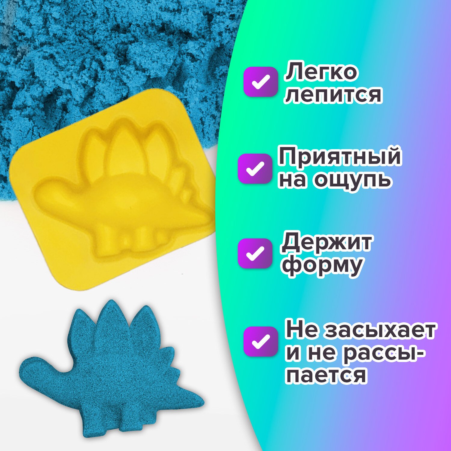 Не рассыпается и не высыхает. Отлично лепится и держит форму. Не прилипает к рукам. Не токсичен. Продается в пластиковом ведерке с 2 формочками для лепки. Компактен в хранении - уменьшается в объеме при собирании в форму или контейнер. Цвет - синий. Вес - 500 г.