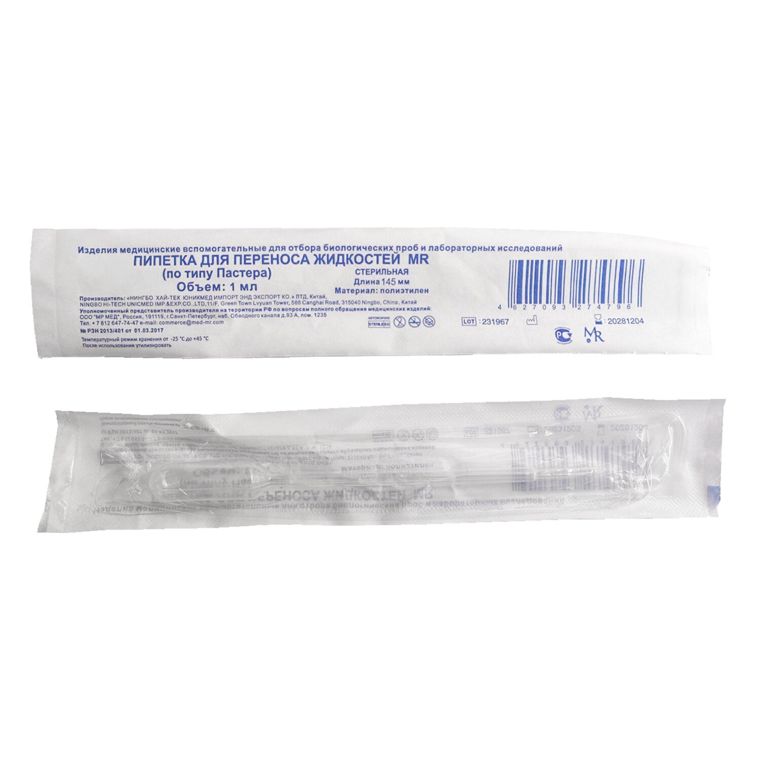 Пипетка Пастера стерильная 1 мл КОМПЛЕКТ 250шт, MR MED, шк 74796