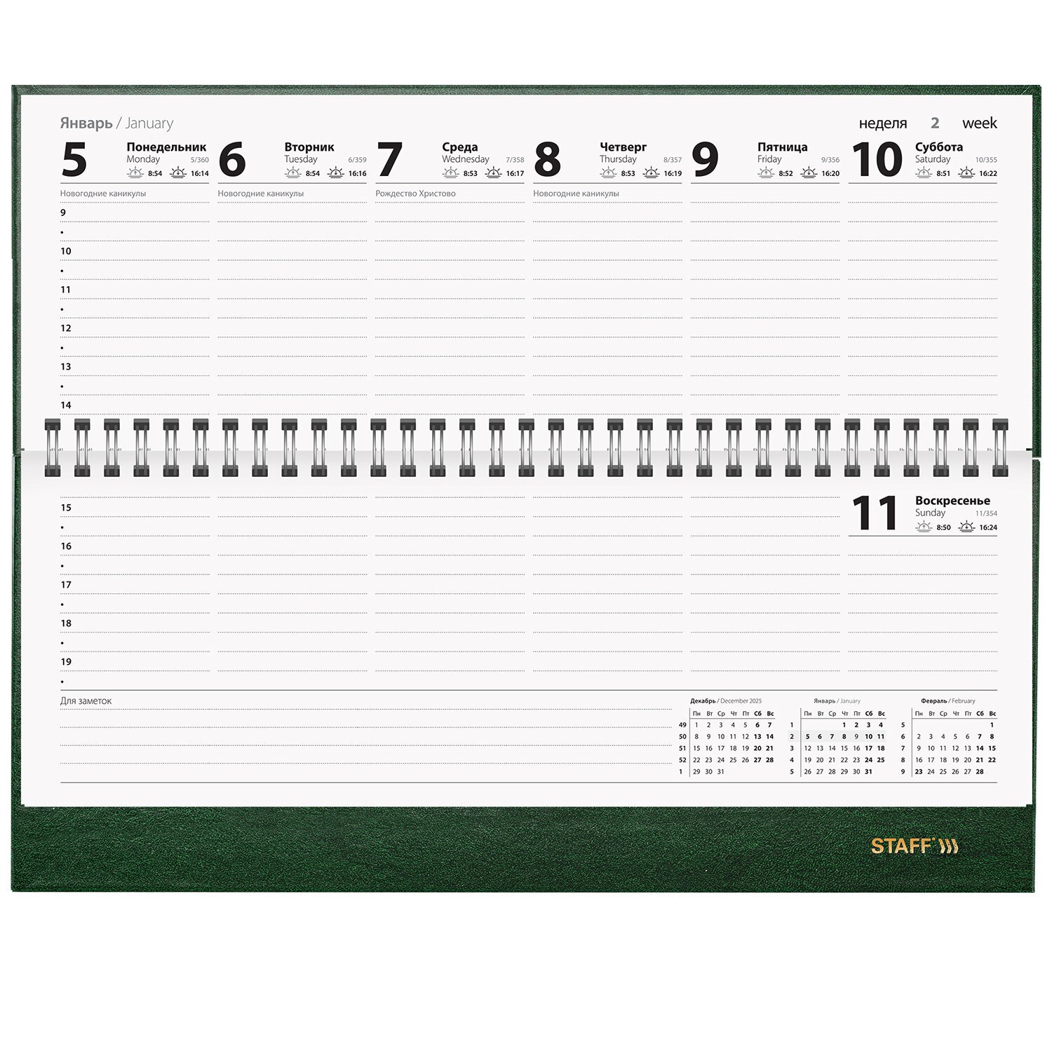 В датированном планинге STAFF все дни недели расположены на одном развороте, благодаря чему очень удобно планировать важные дела на неделю вперед.