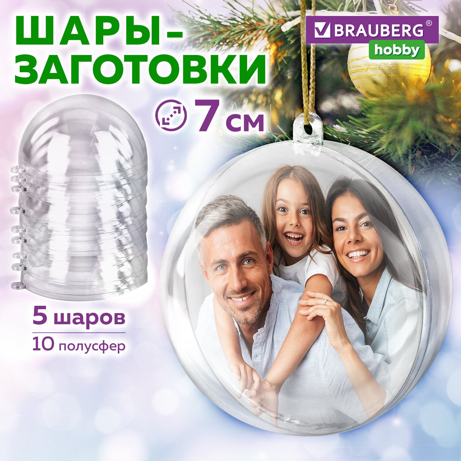 Пластиковые шары для поделок BRAUBERG HOBBY предназначены для взрослых, увлекающихся творчеством, и детей старше 3 лет. В набор входят 10 половинок (полусфер) из прозрачного пластика диаметром 7 см. Они имеют удобную конструкцию с "ушками", которые необходимо соединить, чтобы получилась петля для подвешивания. Таким образом из 10 половинок образуются 5 прозрачных пластиковых шаров, являющихся замечательными заготовками как для новогоднего творчества, так и для интерьерных украшений – гирлянд, фотоподелок, мобиля.