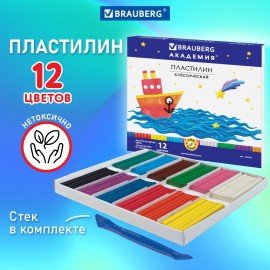 Пластилин классический BRAUBERG "АКАДЕМИЯ", 12 цветов, 240 г, со стеком, картонная упаковка, 103256