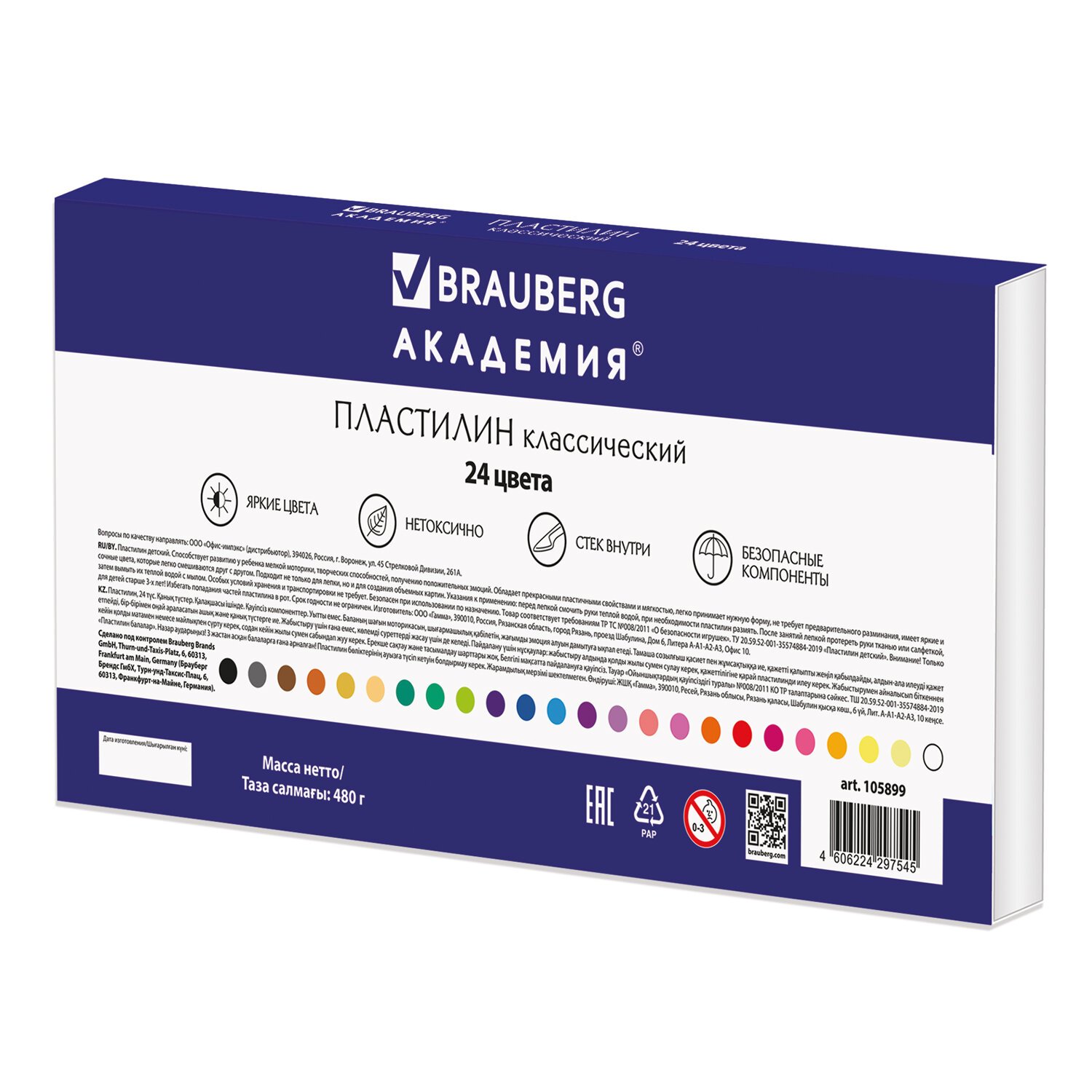 Пластилин классический BRAUBERG "АКАДЕМИЯ", 24 цвета, 480 г, со стеком, ВЫСШЕЕ КАЧЕСТВО, 105899