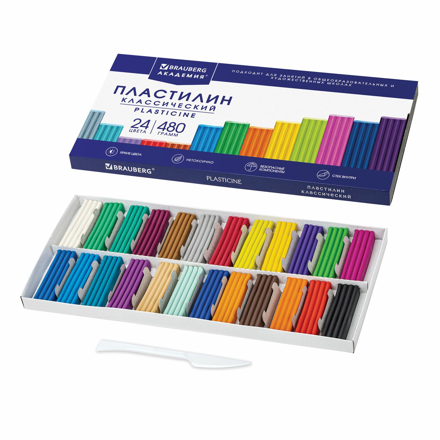 Пластилин классический BRAUBERG "АКАДЕМИЯ", 24 цвета, 480 г, со стеком, ВЫСШЕЕ КАЧЕСТВО, 105899