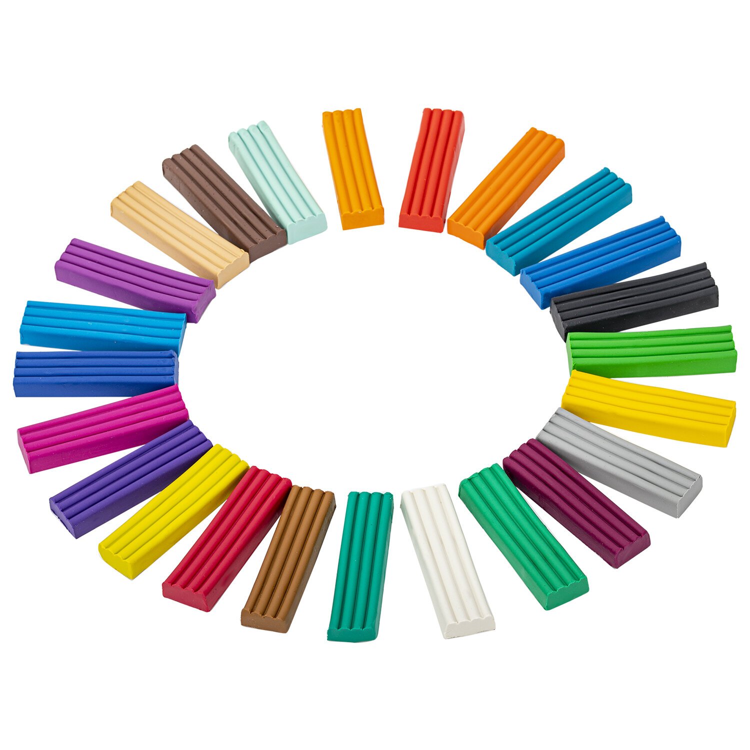 В составе набора 24 бруска по 20 г разных цветов: белый, черный, синий, красный, желтый, зеленый, коричневый, оранжевый, голубой, светло-зеленый, фиолетовый, лиловый, светло-коричневый, темно-красный, бирюзовый, сиреневый, телесный, серый, мятный, светло-оранжевый, красно-фиолетовый, ультрамарин, изумрудный, лимонный. Масса набора - 480 г. Со стеком.