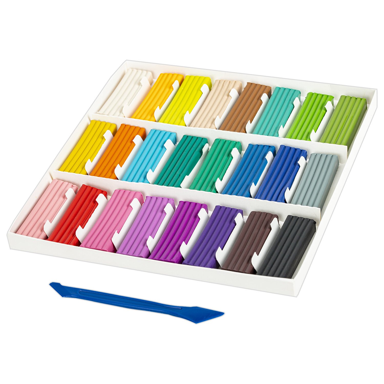 В составе набора 24 бруска по 20 г разных цветов: белый, черный, коричневый, светло-коричневый, бежевый, серый, красный, желтый, лимонный, оранжевый, неоновый оранжевый, голубой, синий, темно-синий, бирюзовый, зеленый, темно-зеленый, травянистый, холодный зеленый, фиолетовый, темно-фиолетовый, сиреневый, розовый, светло-розовый. Масса набора – 480 г. Со стеком.