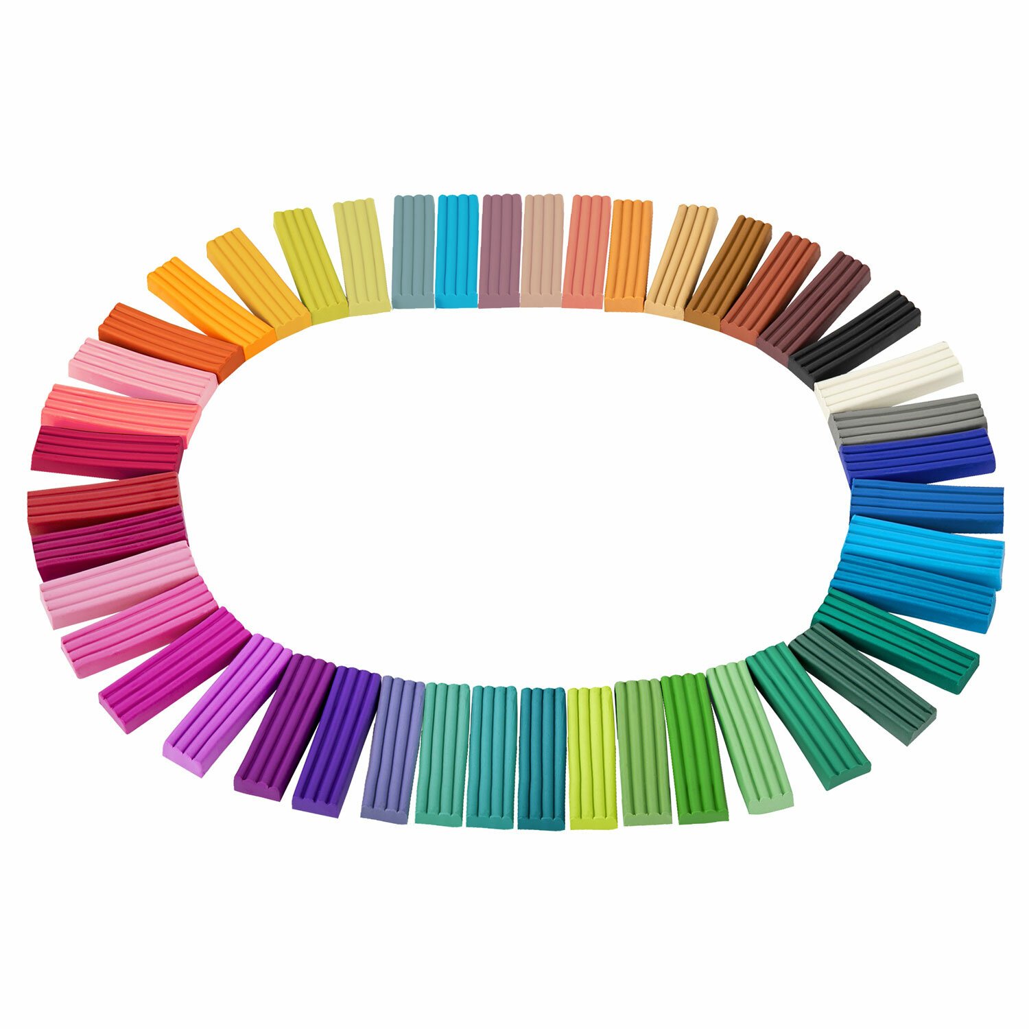 В составе набора 44 бруска по 15 г разных цветов: белый, телесный, банан, охра, ярко-оранжевый, манго, оранжевый, коралловый, красный, вишневый, малиновый, светло-розовый, розовый, лиловый, светло-сиреневый, темно-лиловый, сиреневый, слива, фиолетовый, ультрамарин, светло-синий, синий, тёмный желтый, желтый, зеленый арбуз, лимон, оливковый, салатовый, мятная жвачка, светло-зеленый, зеленый, изумрудный, темно-зеленый, бирюзовый, голубой, ежевика, светло-серый, серый, терракотовый, красно-коричневый, светло-коричневый, капучино, темно-коричневый, черный.