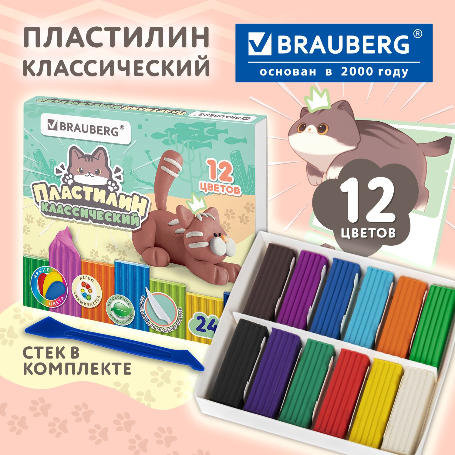 Пластилин классический "МИЛЫЕ КОТЫ", 12 цветов, 240 г, СТЕК, ВЫСШЕЕ КАЧЕСТВО, BRAUBERG, 107353