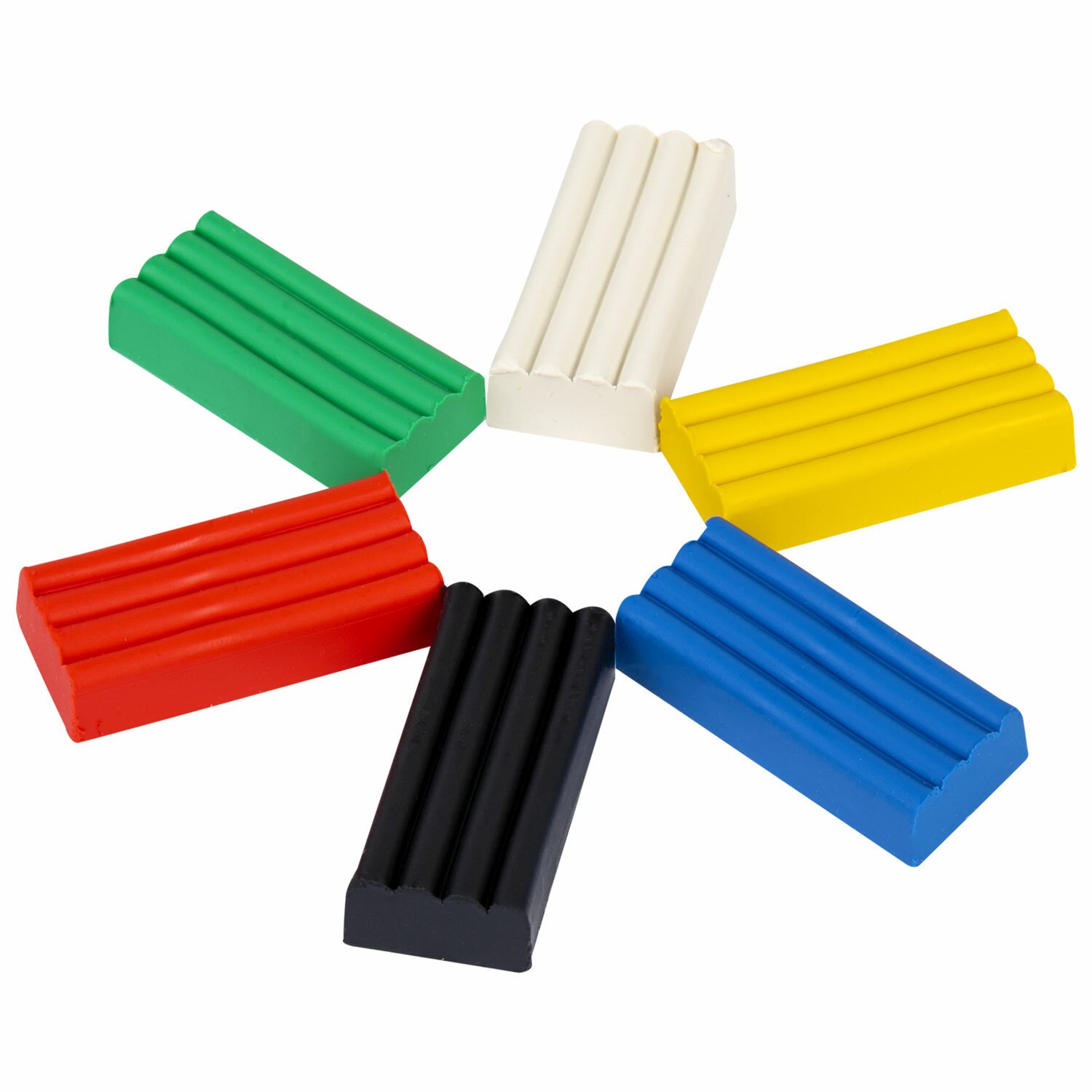 В составе набора 6 цветов: белый, черный, синий, красный, зеленый, желтый. Масса набора - 90 г. Поставляется в комплекте со стеком, с помощью которого ребенок может разделять пластилин на части или наносить орнамент на свои поделки.