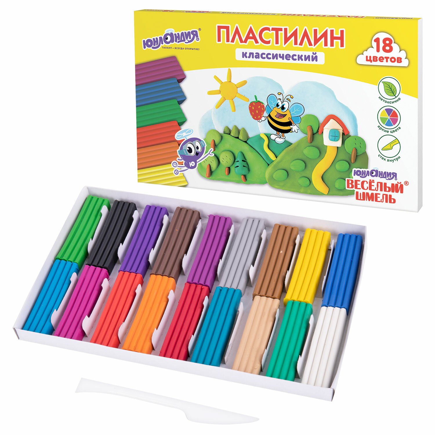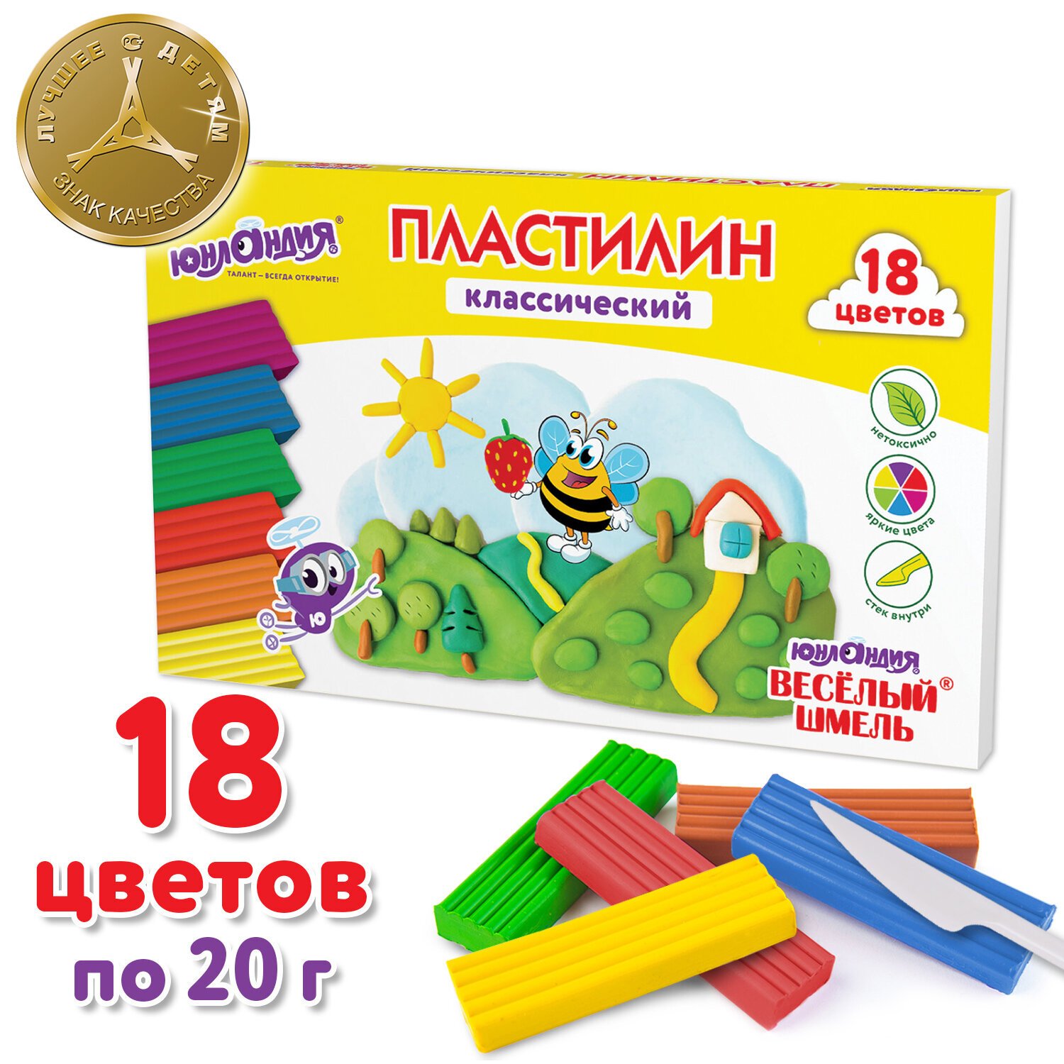Пластилин классический ЮНЛАНДИЯ "ВЕСЁЛЫЙ ШМЕЛЬ", 18 цветов, 360 грамм, стек, ВЫСШЕЕ КАЧЕСТВО, 106432