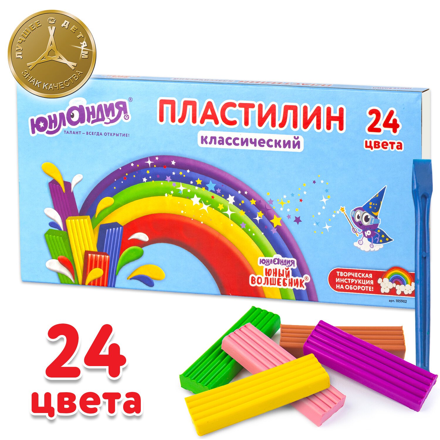 Пластилин классический ЮНЛАНДИЯ "ЮНЫЙ ВОЛШЕБНИК", 24 цвета, 480 г, со стеком, ВЫСШЕЕ КАЧЕСТВО, 105902