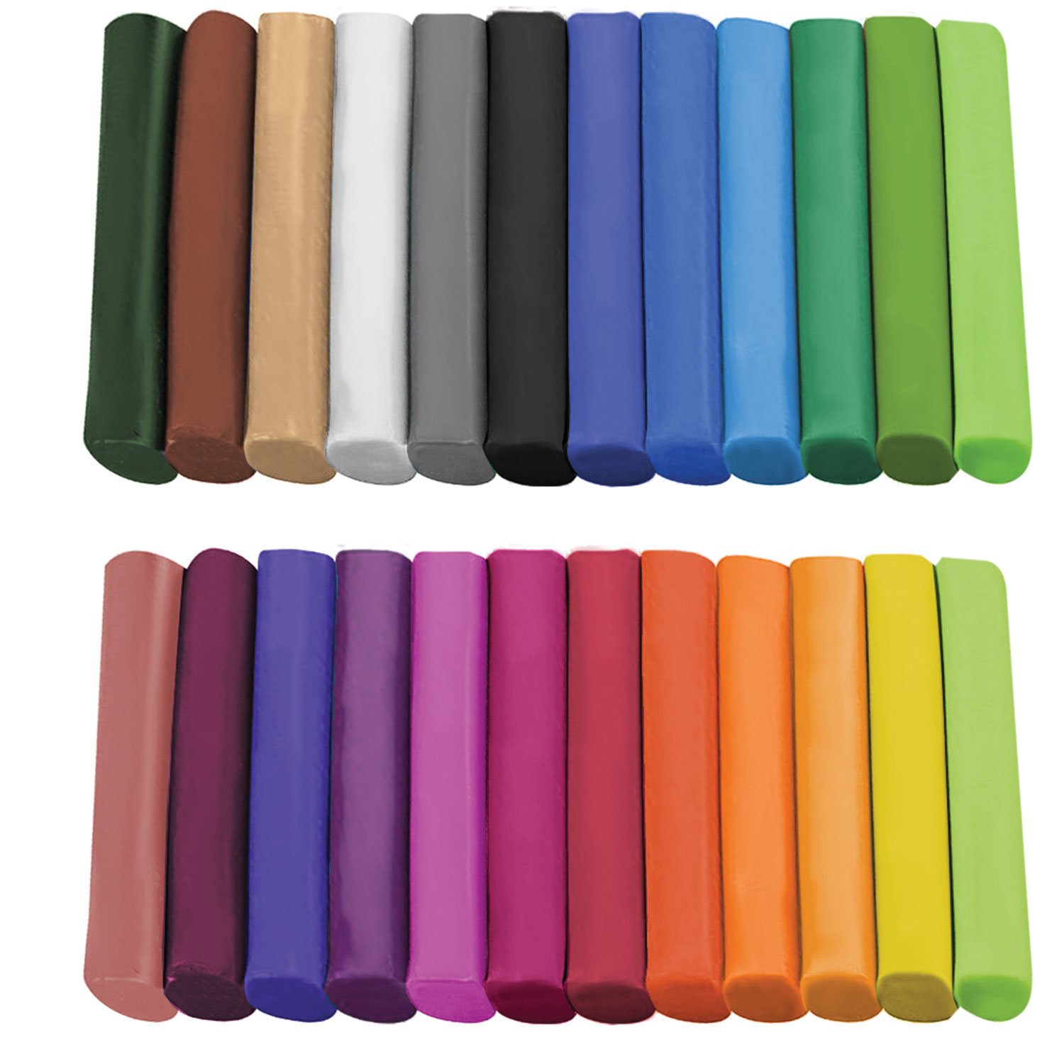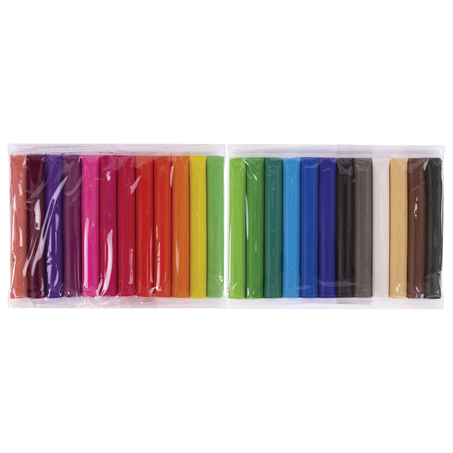 В него входит 24 бруска разных цветов: темно-зеленый, коричневый, кремовый, белый, серый, черный, темно-синий, синий, голубой, зеленый, светло-зеленый, салатовый, неоновый зеленый, лососевый, ягодный, светло-фиолетовый, фиолетовый, нежно-розовый, розовый, красный, коралловый, морковный, оранжевый, желтый. Масса набора - 480 г.