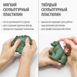 Отлично держит форму и устойчив к перепадам температуры. Не оставляет пятен, не липнет к рукам. Твердый пластилин необходимо дольше разогревать, фигуры из него лучше сохраняют форму. Пластилин весом 1 кг упакован в полипропиленовую пленку.