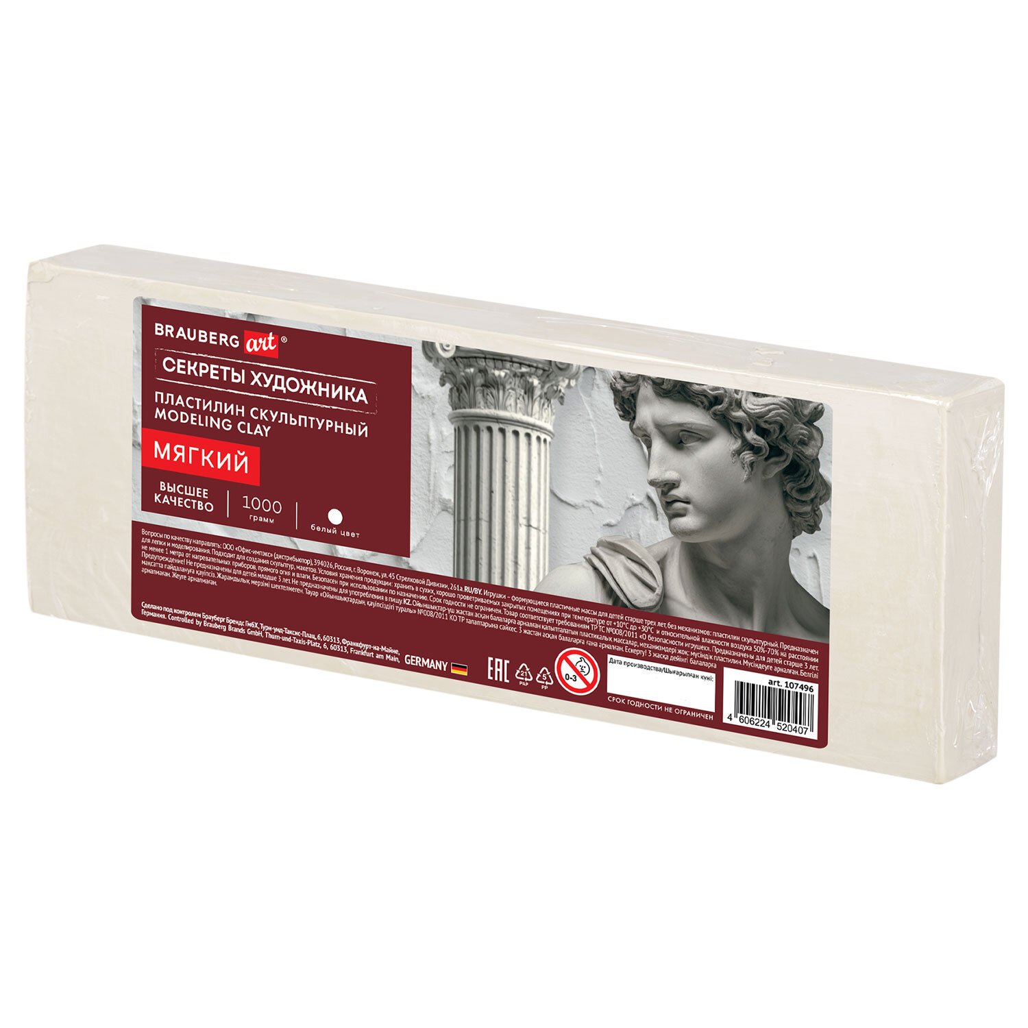 Пластилин скульптурный МЯГКИЙ БЕЛЫЙ "Секреты художника", 1 кг, BRAUBERG ART, 107496