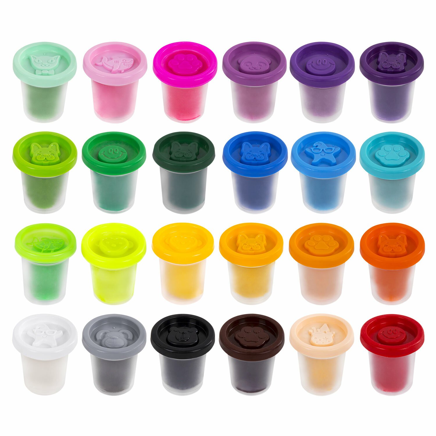 В набор входят 24 баночки теста для лепки ярких и нежных пастельных цветов: фиолетовый, оранжевый, белый, черный, красный, синий, изумрудный, желтый, неоновый голубой, неоновый салатовый, неоновый желтый, неоновый розовый, пастельный желтый, телесный, серый, пастельный салатовый, салатовый, мятный, пастельный оранжевый, фуксия, пастельный фиолетовый, пастельный розовый, бордовый, пастельный голубой. Цвета можно смешивать между собой и получать новые оттенки.