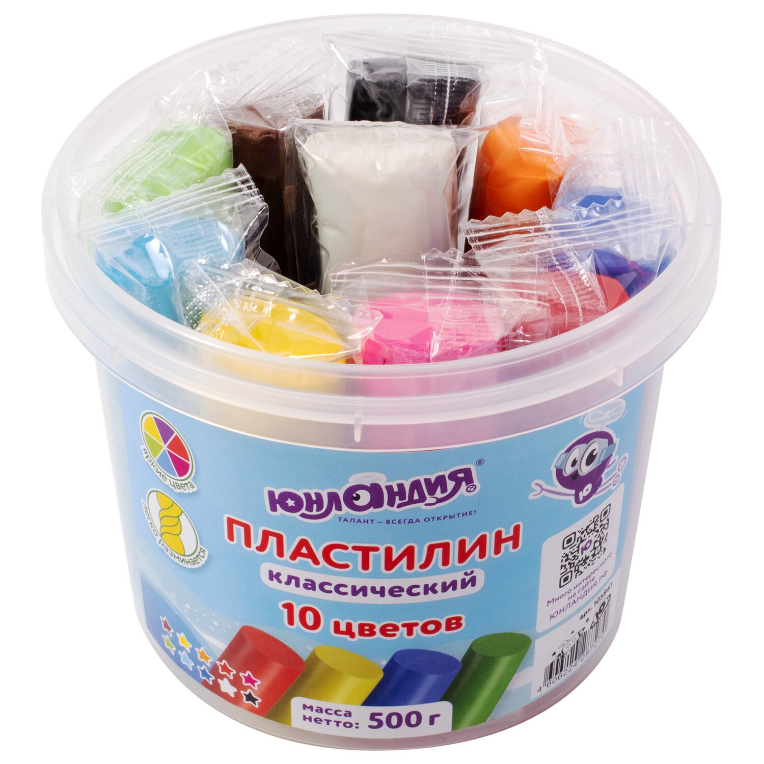 Масса набора - 500 г. В наборе 10 брусков по 50 г, каждый из которых упакован в прозрачный пакет. 10 цветов: белый, желтый, красный, синий, черный, розовый, оранжевый, зеленый, голубой, коричневый. Пластилин обладает прекрасными пластичными свойствами и мягкостью, легко принимает нужную форму. Не токсичен, безопасен для детей. Пластилин упакован в пластиковое ведерко, которое плотно закрывается и не даст растеряться брусочкам. Предназначен для детей старше 3-х лет.