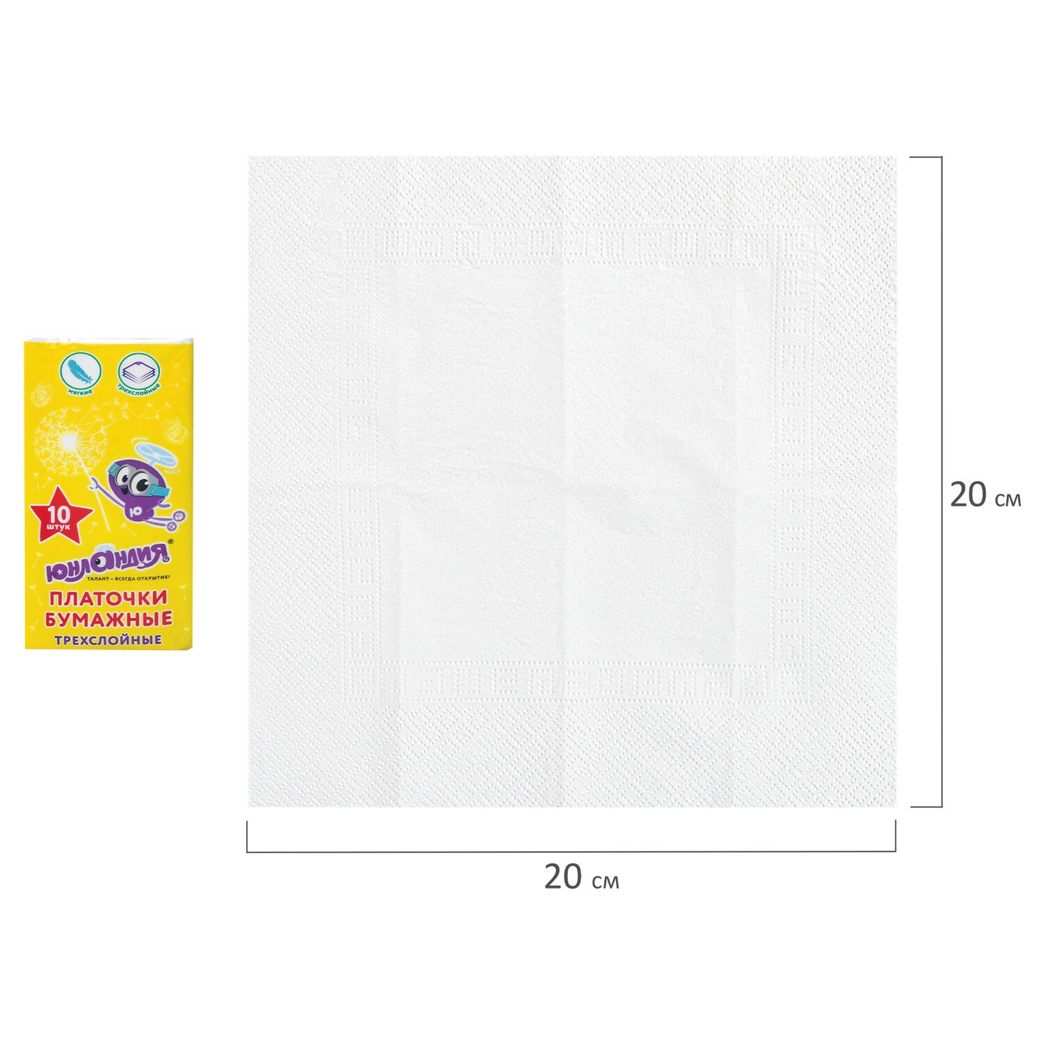 Платки носовые (1 штука) ЮНЛАНДИЯ, 3-х слойные, 20х20 см, 129898