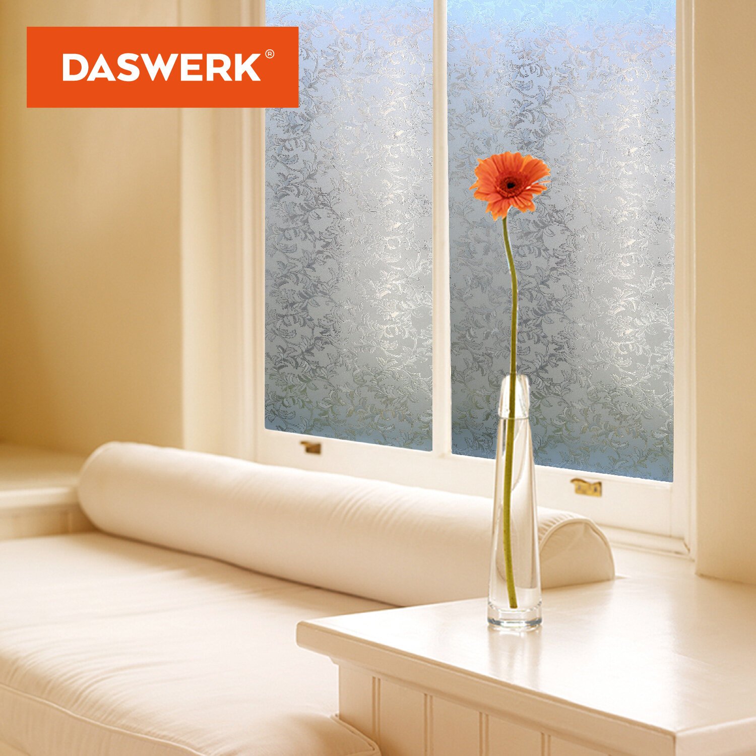 Плёнка на окно DASWERK поставляется в рулоне шириной 75 см и длиной 1,5 м. Плёнка подходит для установки на комнатные и балконные окна, стеклянные двери и перегородки, дверцы шкафов и полок, а также дверцы и перегородки душевых кабин. Оконная плёнка не затемняет помещение, пропуская 75% солнечного света и тепла. Отражая 75% ультрафиолетового излучения, плёнка защищает предметы мебели и интерьера от выгорания и потери внешнего вида. Лицевая поверхность имитирует матовое стекло, украшая и подчёркивая интерьер, а также защищая от любопытных взглядов.