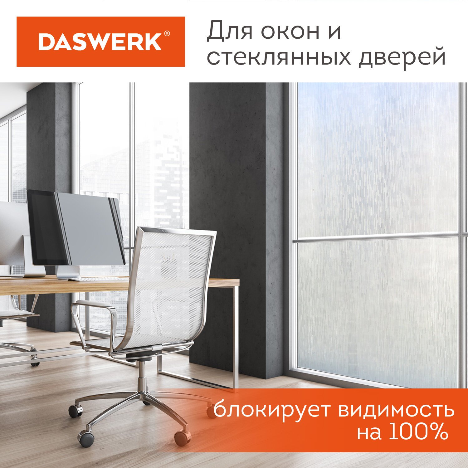 Плёнка на окно DASWERK поставляется в рулоне шириной 75 см и длиной 1,5 м. Плёнка подходит для установки на комнатные и балконные окна, стеклянные двери и перегородки, дверцы шкафов и полок, а также дверцы и перегородки душевых кабин. Оконная плёнка не затемняет помещение, пропуская 75% солнечного света и тепла. Отражая 75% ультрафиолетового излучения, плёнка защищает предметы мебели и интерьера от выгорания и потери внешнего вида. Лицевая поверхность имитирует матовое стекло, украшая и подчёркивая интерьер, а также защищая от любопытных взглядов.