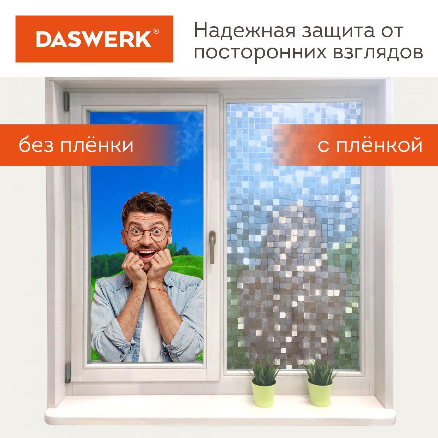 Плёнка на окно DASWERK поставляется в рулоне шириной 75 см и длиной 1,5 м. Плёнка подходит для установки на комнатные и балконные окна, стеклянные двери и перегородки, дверцы шкафов и полок, а также дверцы и перегородки душевых кабин. Оконная плёнка не затемняет помещение, пропуская 75% солнечного света и тепла. Отражая 75% ультрафиолетового излучения, плёнка защищает предметы мебели и интерьера от выгорания и потери внешнего вида. Лицевая поверхность обладает эффектом «радуги» - при попадании солнечных лучей на плёнку свет преломляется, превращая окно в яркий витраж, украшающий и подчёркивающий интерьер, а также защищающий от любопытных взглядов.