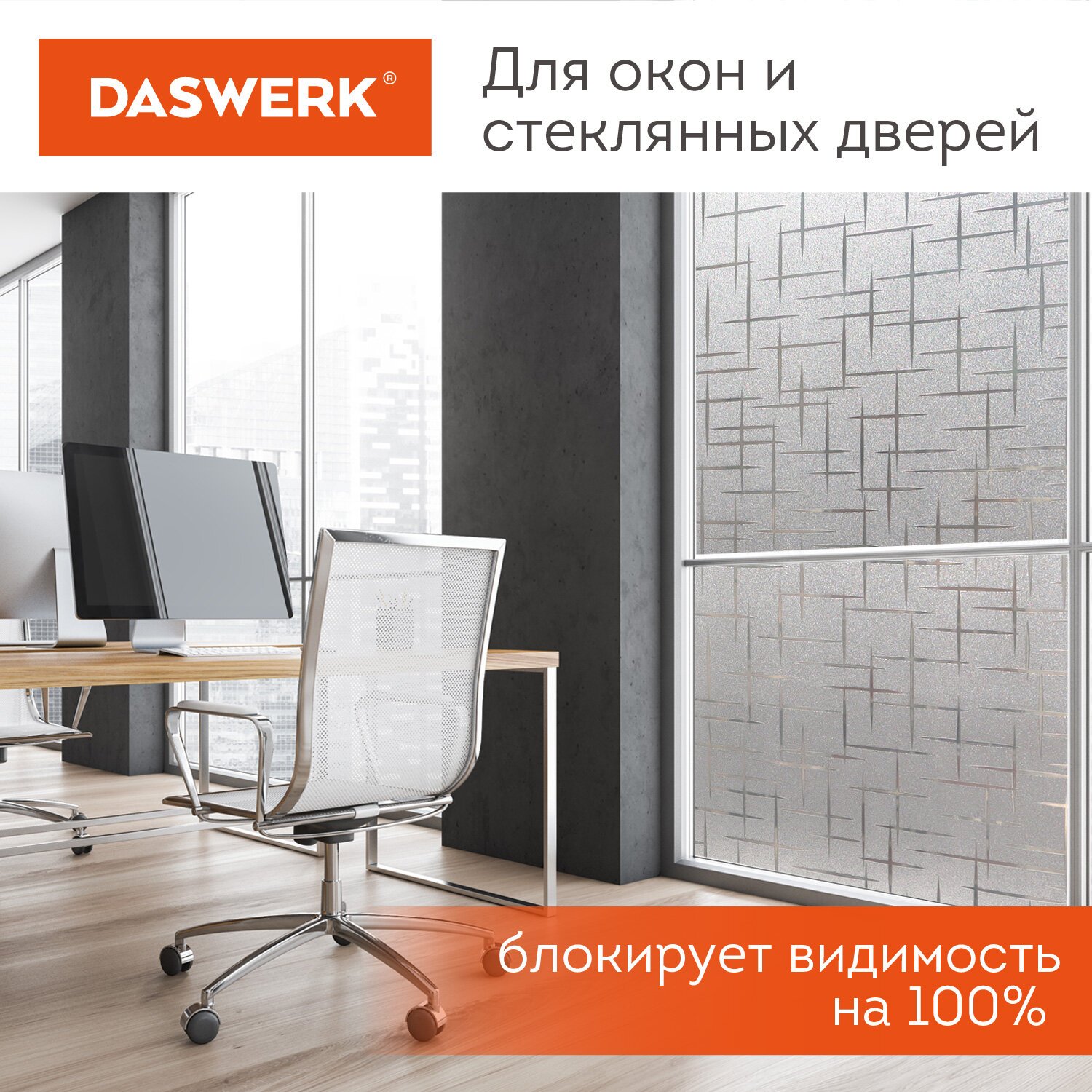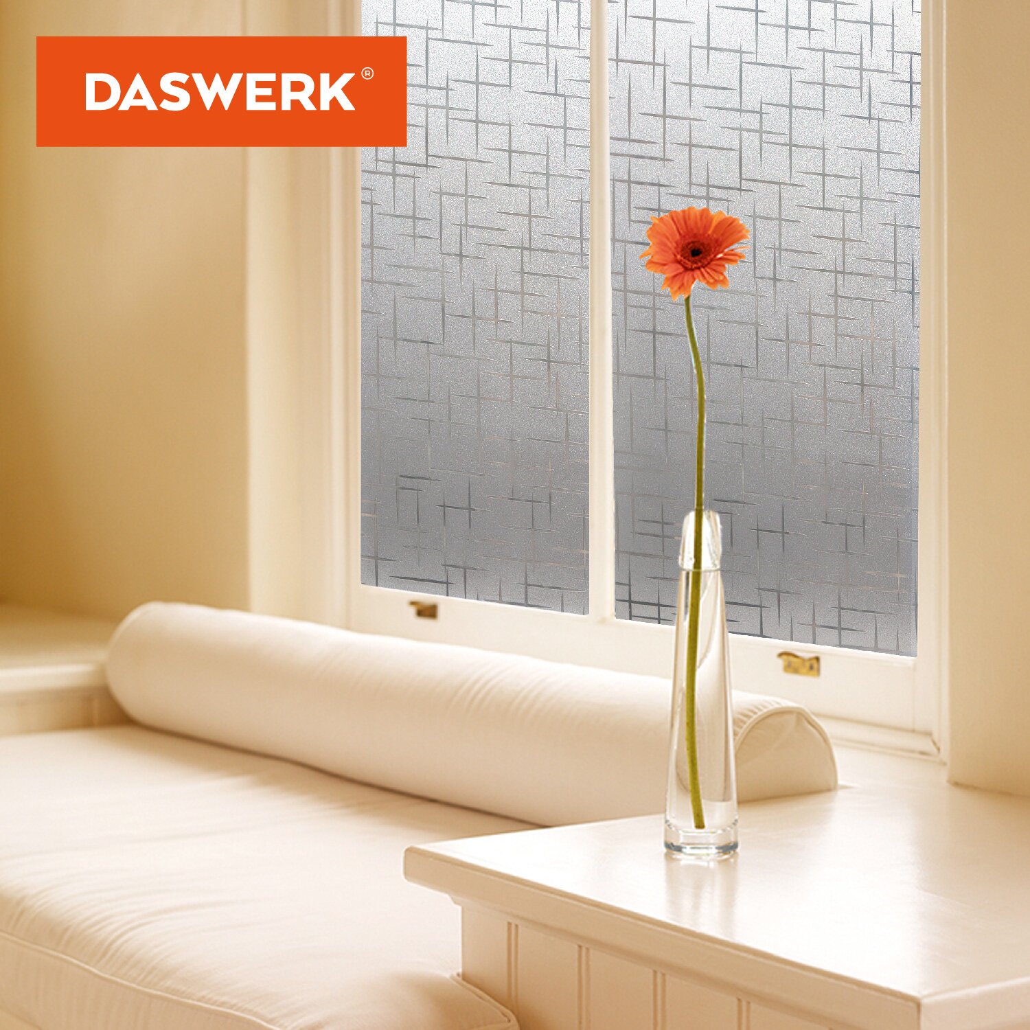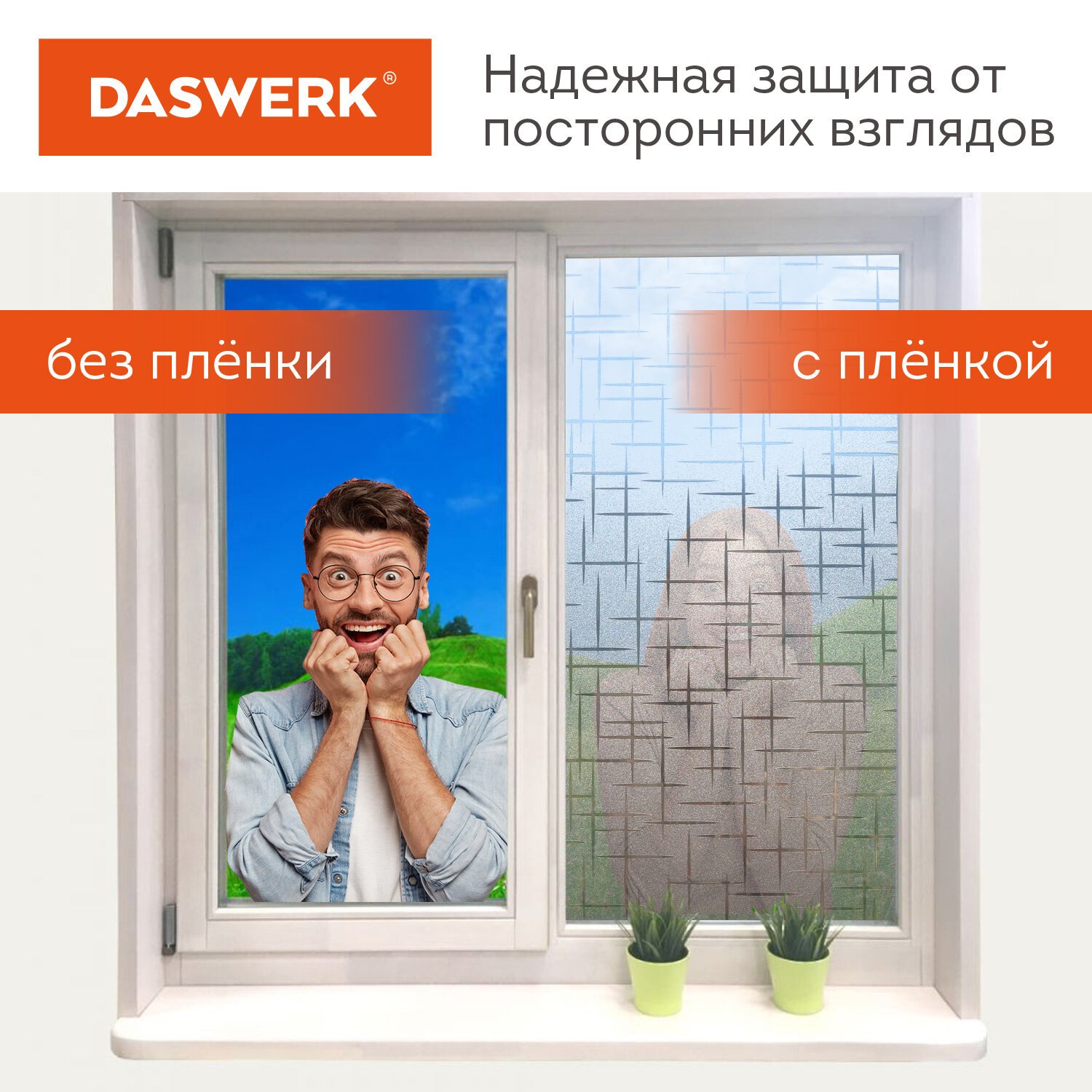 Плёнка на окно DASWERK поставляется в рулоне шириной 75 см и длиной 1,5 м. Плёнка подходит для установки на комнатные и балконные окна, стеклянные двери и перегородки, дверцы шкафов и полок, а также дверцы и перегородки душевых кабин. Оконная плёнка не затемняет помещение, пропуская 75% солнечного света и тепла. Отражая 75% ультрафиолетового излучения, плёнка защищает предметы мебели и интерьера от выгорания и потери внешнего вида. Лицевая поверхность имитирует матовое стекло, украшая и подчёркивая интерьер, а также защищая от любопытных взглядов.
