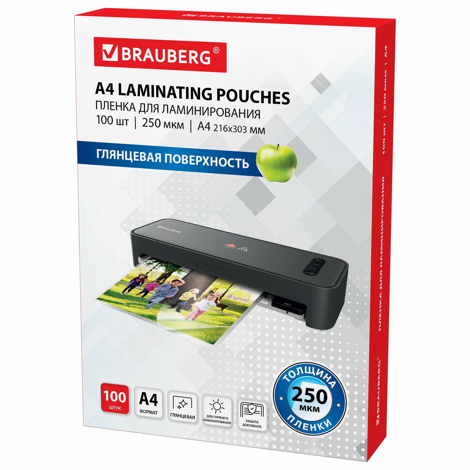 Пленка для ламинирования BRAUBERG формата А4 (216х303 мм) имеет уникальный состав: полиэтилентерефталат (PET), этиленвинилацетат (EVA), полиэтилен (LDPE). Промежуточный слой полиэтилена (LDPE) выступает как связующий элемент между слоями PET и EVA, служит дополнительной защитой от вероятного вытекания клея из-под пленки при ламинировании. Полиэтилен (PE) придает пакетам прочность эластичность и износостойкость. Глянцевое покрытие пленки способствует сохранению и максимальной передаче цвета ламинируемого изображения.