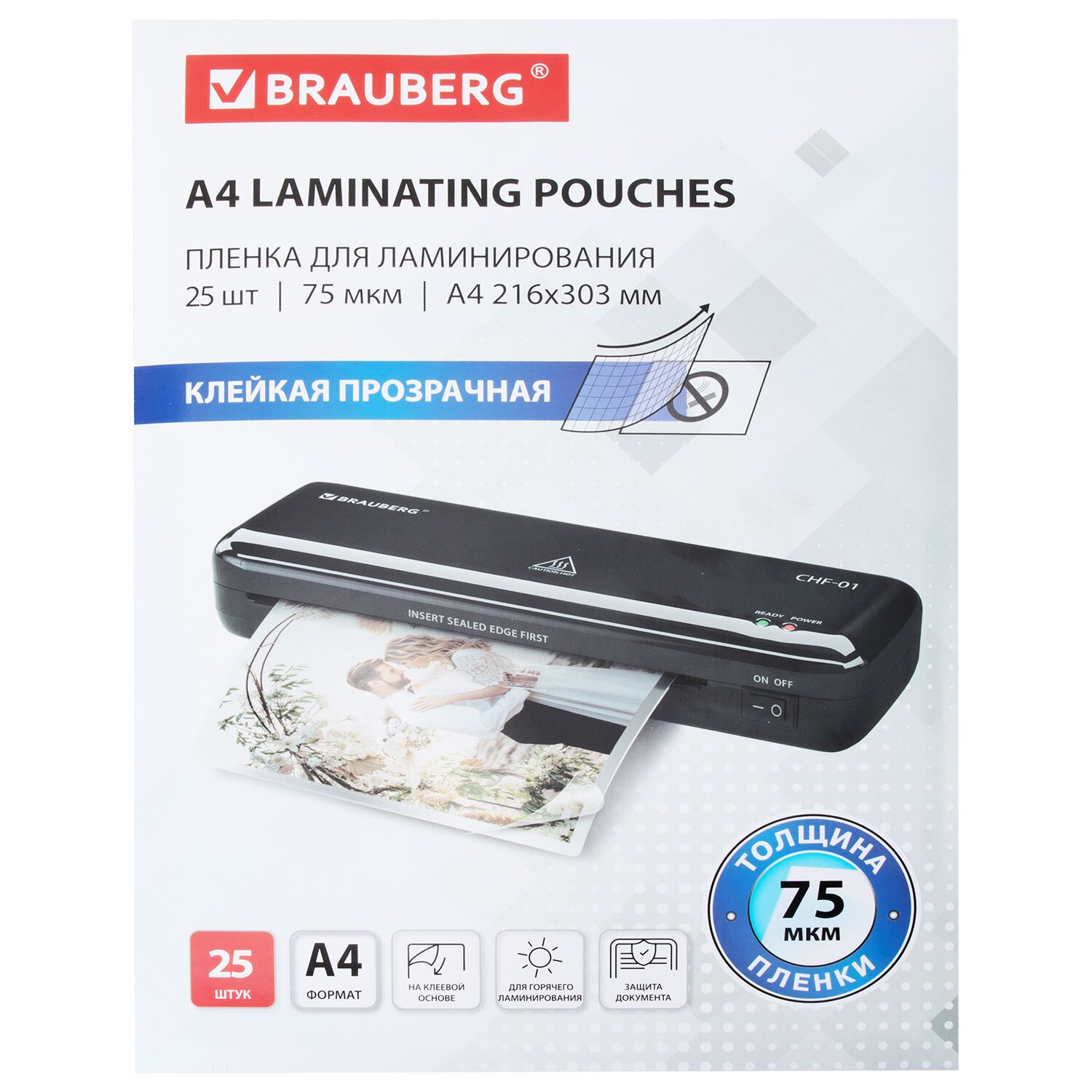 Пленка для ламинирования BRAUBERG формата А4 (216х303 мм) имеет уникальный состав: полиэтилентерефталат (PET), этиленвинилацетат (EVA), полиэтилен (LDPE). Промежуточный слой полиэтилена (LDPE) выступает как связующий элемент между слоями PET и EVA, служит дополнительной защитой от вероятного вытекания клея из-под пленки при ламинировании. Полиэтилен (PE) придает пакетам прочность эластичность и износостойкость. Глянцевое покрытие пленки способствует сохранению и максимальной передаче цвета ламинируемого изображения.