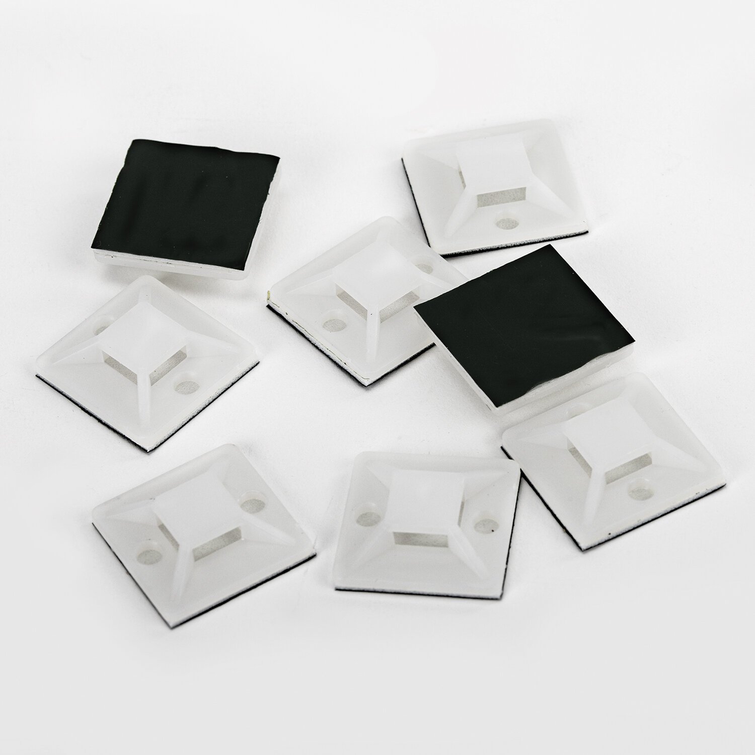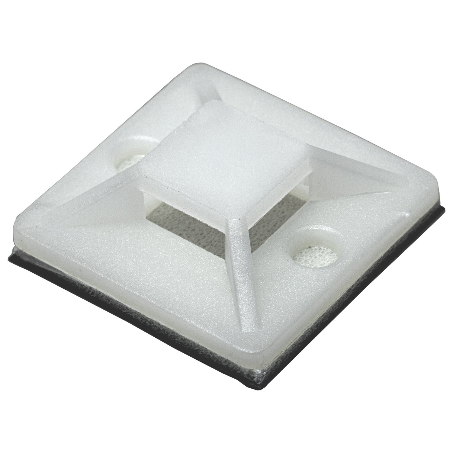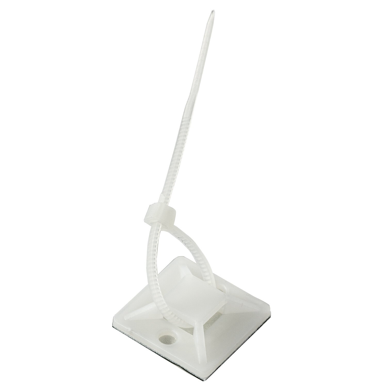 Площадки самоклеящиеся обеспечивают надежное, быстрое и экономичное крепление. Они просты и удобны в использовании: выбрать место для размещения площадки, очистить его поверхность от загрязнений и пыли затем отделить защитную пленку от самоклеящейся поверхности площадки. Расположить площадку клейкой стороной к монтируемой поверхности и прижать с усилием. В конце необходимо продеть стяжку в крепежное отверстие и затянуть.